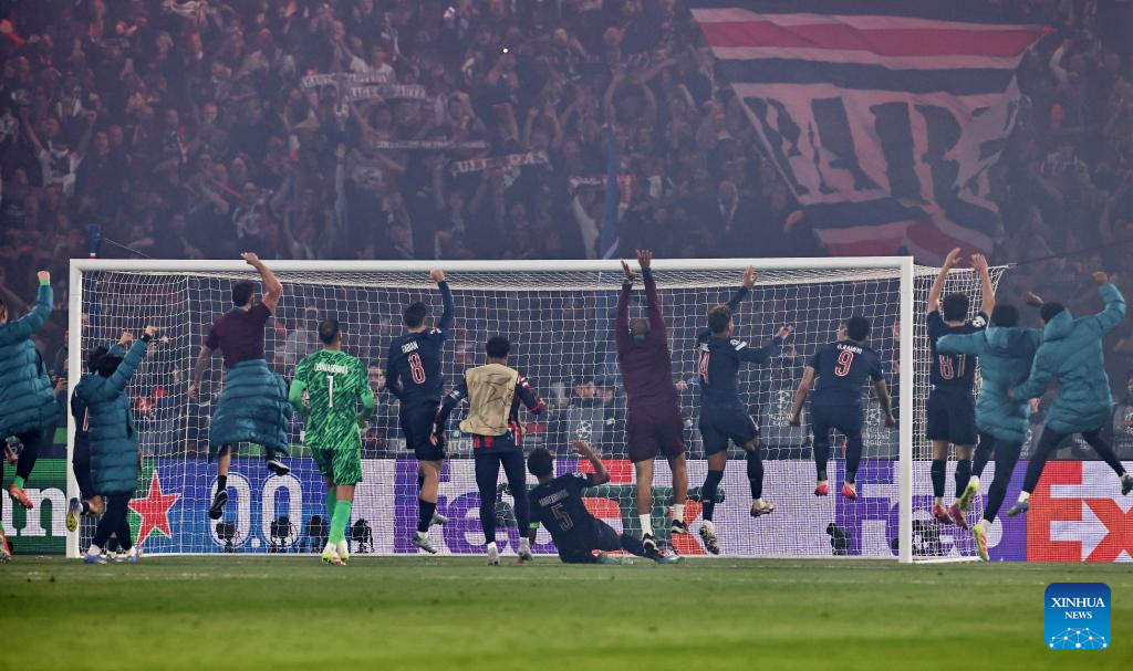Paris Saint-Germain's players celebrate advancing to the final after winning the UEFA Champions League semifinal second leg match between Paris Saint-Germain and Arsenal at the Parc des Princes stadium in Paris, France, May 7, 2025. (Xinhua/Gao Jing)