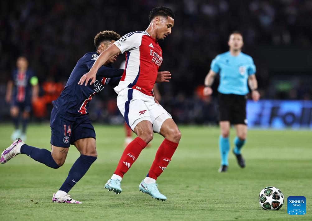 Arsenal's William Saliba (R) vies with Paris Saint-Germain's Desire Doue during the UEFA Champions League semifinal second leg match between Paris Saint-Germain and Arsenal at the Parc des Princes stadium in Paris, France, May 7, 2025. (Xinhua/Gao Jing)