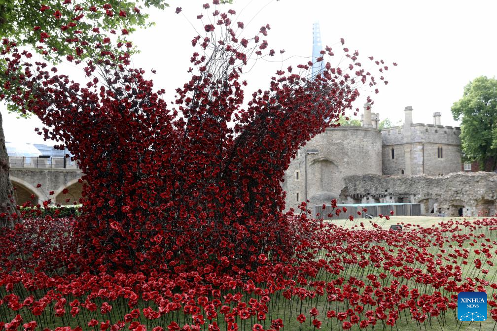 This photo taken on May 7, 2025 shows a view of ceramic poppies displayed at the Tower of London in London, Britain. An installation of nearly 30,000 ceramic poppies is on display from May 6 to Nov. 11 at the Tower of London, commemorating the 80th anniversary of the end of the Second World War. (Xinhua/Li Ying)