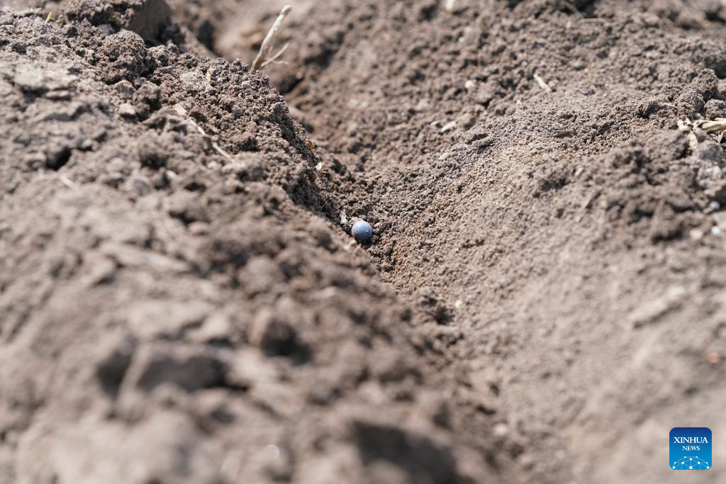 This photo taken on May 8, 2025 shows a soybean seed sowed in a dry field of a farming company under the Beidahuang Group, in Shuangyashan City, northeast China's Heilongjiang Province. At present, the spring sowing in Heilongjiang cultivation areas are in full swing. All agricultural production units of Beidahuang Group, one of China's leading agricultural conglomerates, are seizing the farming season and busy with the sowing operations in both paddy rice fields and dry fields. (Xinhua/Wang Song)