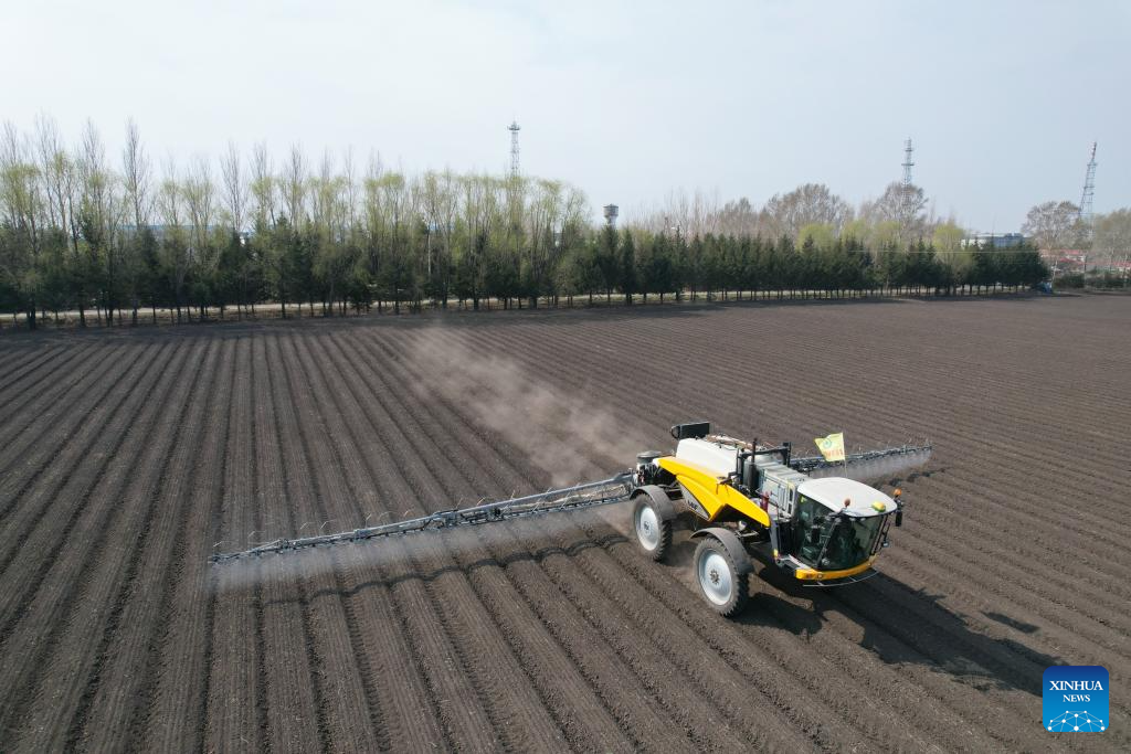 A drone photo taken on May 8, 2025 shows an agricultural machine conducting soil treatment in a field of a farming company under Beidahuang Group in northeast China's Heilongjiang Province. At present, the spring sowing in Heilongjiang cultivation areas are in full swing. All agricultural production units of Beidahuang Group, one of China's leading agricultural conglomerates, are seizing the farming season and busy with the sowing operations in both paddy rice fields and dry fields. (Photo by Xu Yingxian/Xinhua)