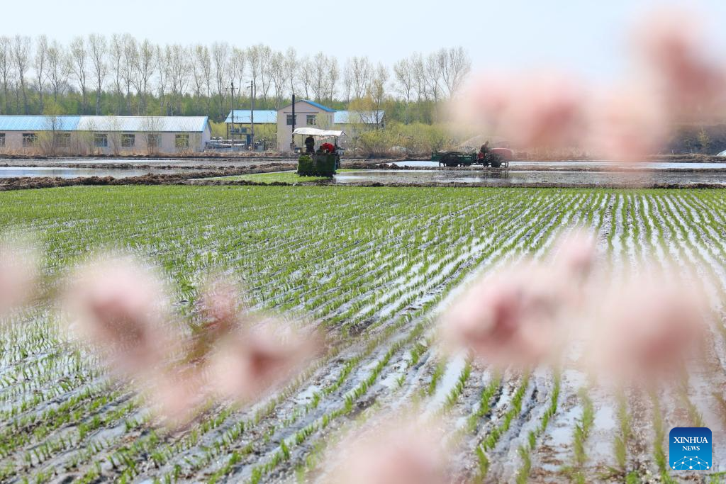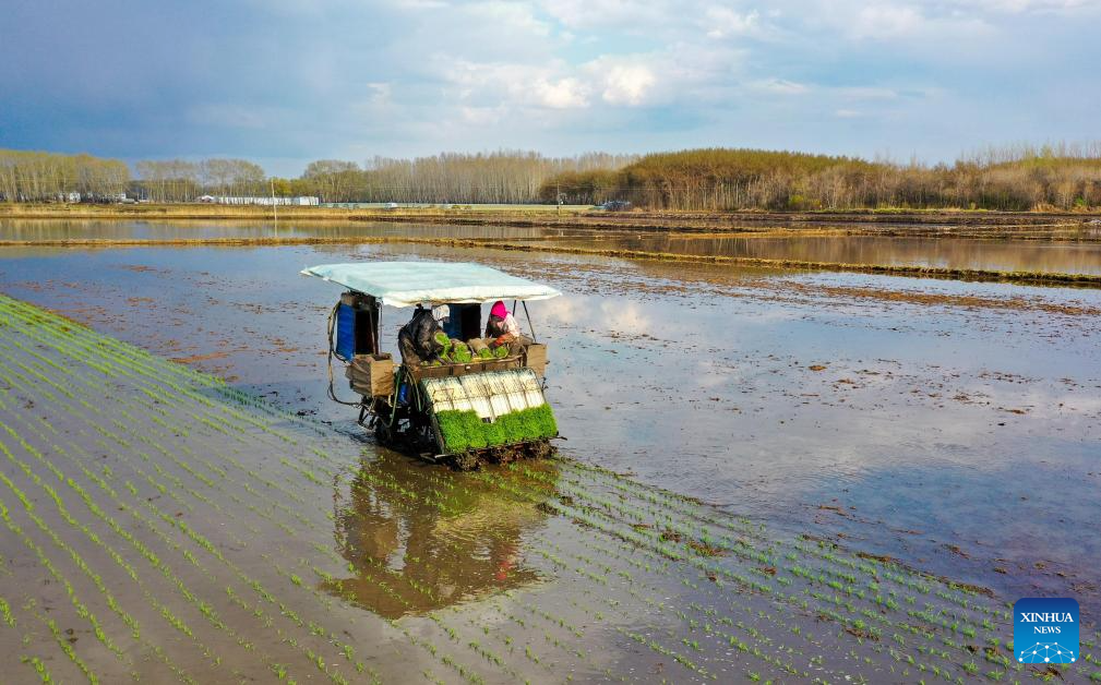 Farmers operate high-speed transplanters powered by the Beidou satellite navigation system in a paddy rice field of a farm of Beidahuang Group in northeast China's Heilongjiang Province, May 8, 2025. At present, the spring sowing in Heilongjiang cultivation areas are in full swing. All agricultural production units of Beidahuang Group, one of China's leading agricultural conglomerates, are seizing the farming season and busy with the sowing operations in both paddy rice fields and dry fields. (Photo by Li Xing/Xinhua)