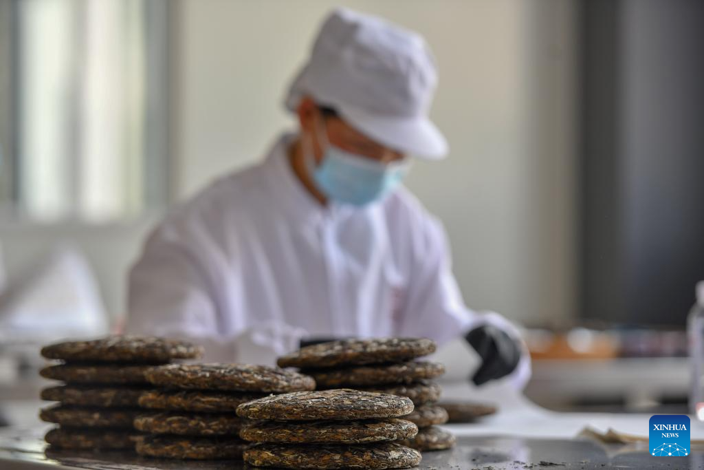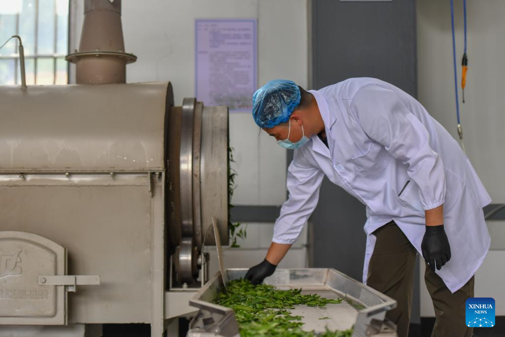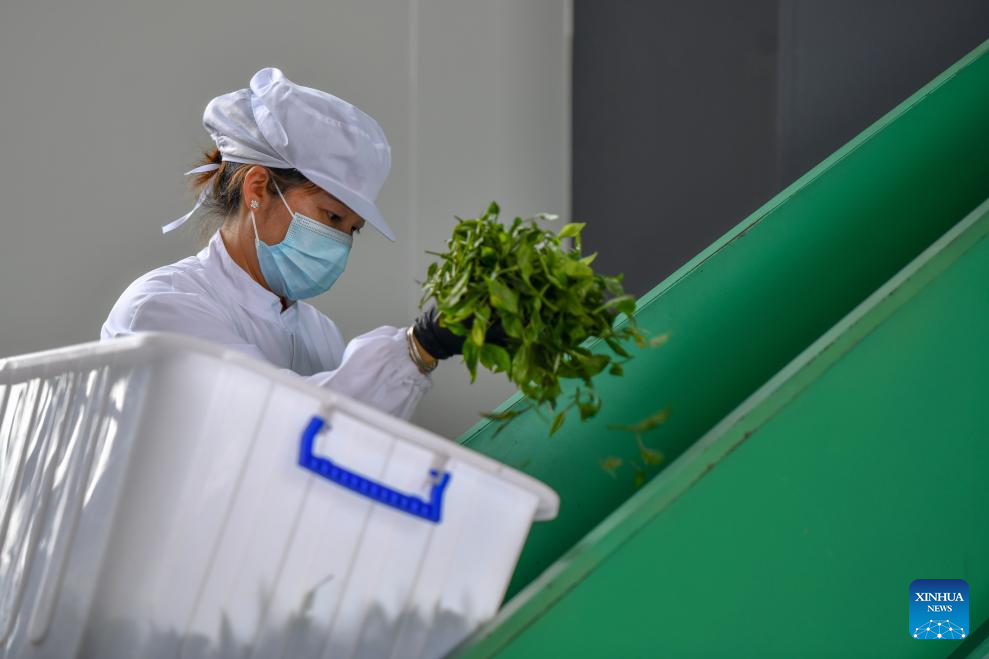 A worker works at a tea processing factory in Mengdong Township, Malipo County, southwest China's Yunnan Province, May 8, 2025. Based on rich tea resources and profound tea culture, Malipo's tea industry has become an important pillar industry in its rural revitalization. The industry has created jobs for more than 4,800 households in the county, increasing an average annual income of 6,700 RMB yuan (about 924 U.S. dollars) per household. (Xinhua/Li Xiyan)