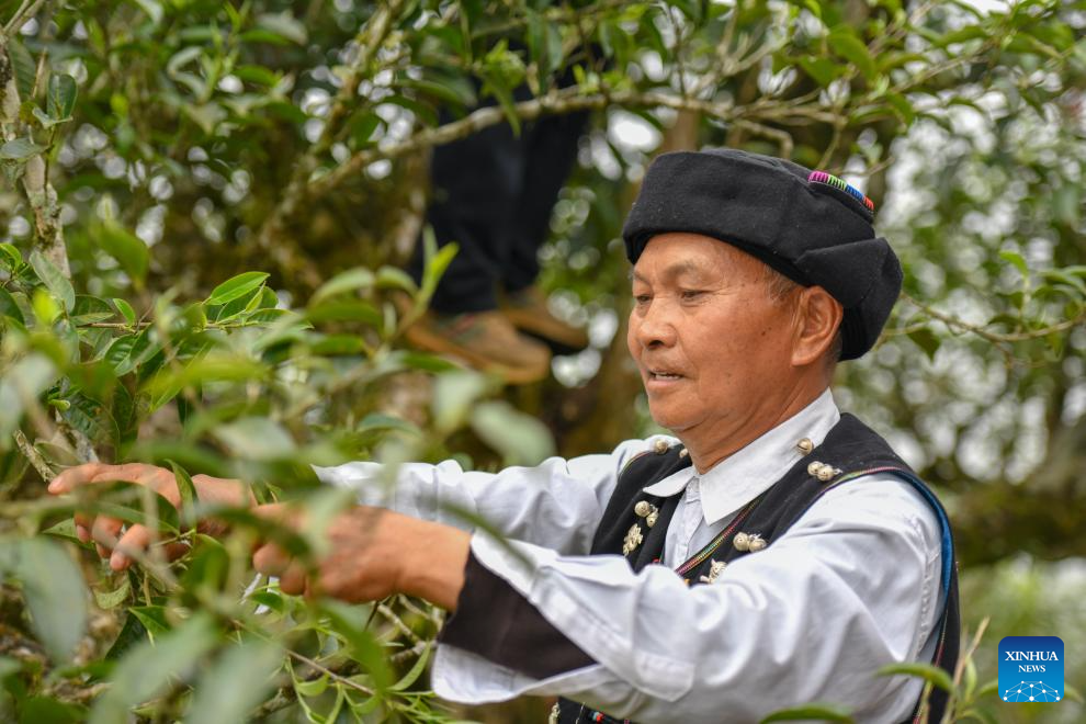 A tea farmer picks tea leaves at a tea garden in Mengdong Township, Malipo County, southwest China's Yunnan Province, May 8, 2025. Based on rich tea resources and profound tea culture, Malipo's tea industry has become an important pillar industry in its rural revitalization. The industry has created jobs for more than 4,800 households in the county, increasing an average annual income of 6,700 RMB yuan (about 924 U.S. dollars) per household. (Xinhua/Peng Yikai)