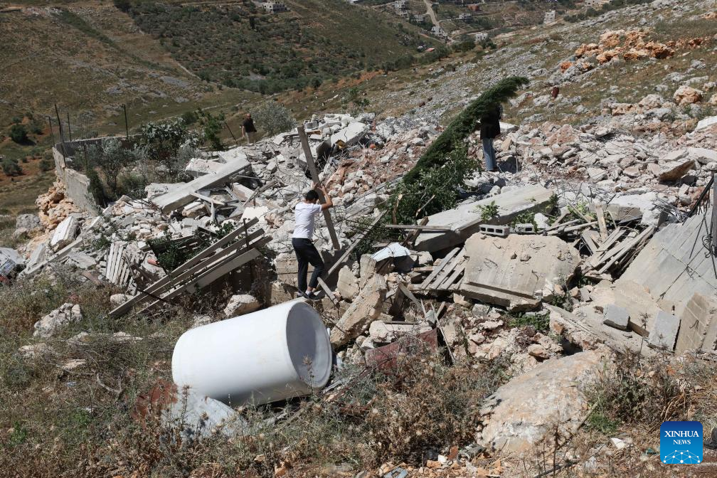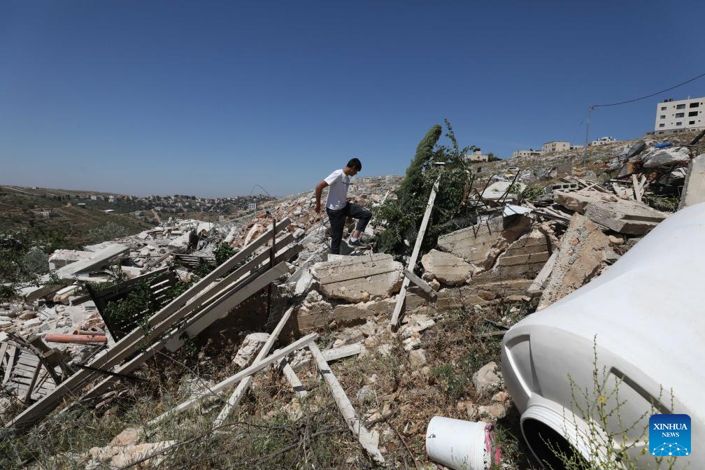 Palestinians are seen at the site of a destroyed house after Israeli excavators demolished it, in the West Bank city of Nablus, on May 8, 2025. (Photo by Nidal Eshtayeh/Xinhua)