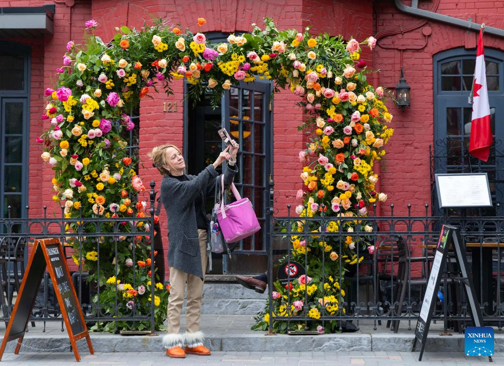A woman takes a selfie with a floral installation during the 2025 Fleurs de Villes SPRING event in Toronto, Canada, on May 8, 2025. Featuring over 30 floral installations created by local florists, the annual event is held here from May 7 to May 11 this year. (Photo by Zou Zheng/Xinhua)