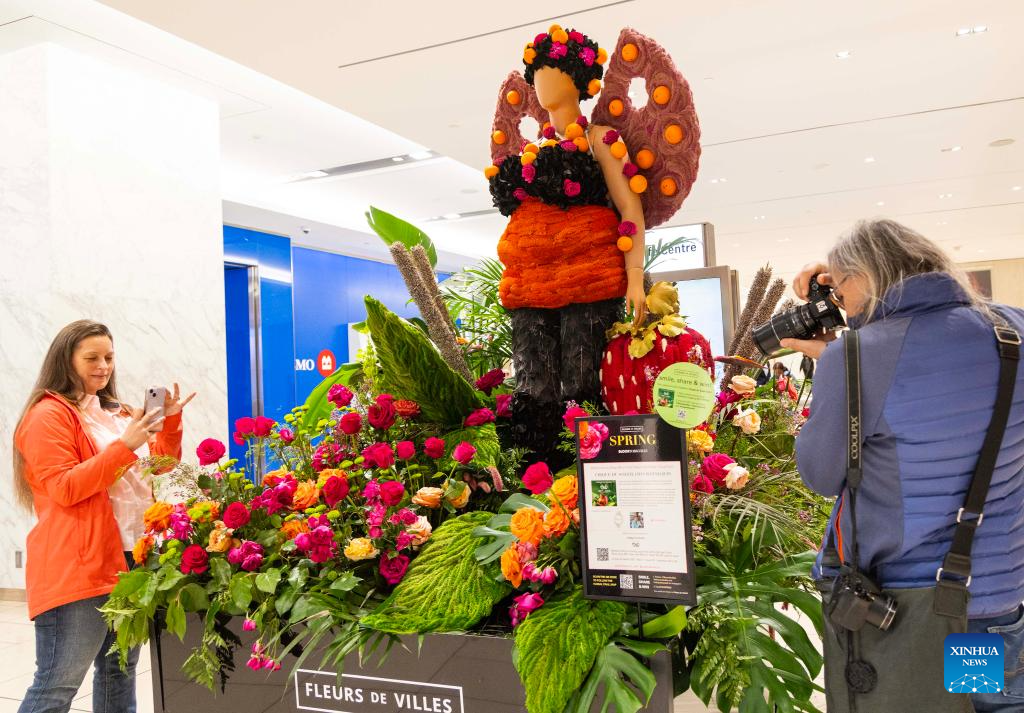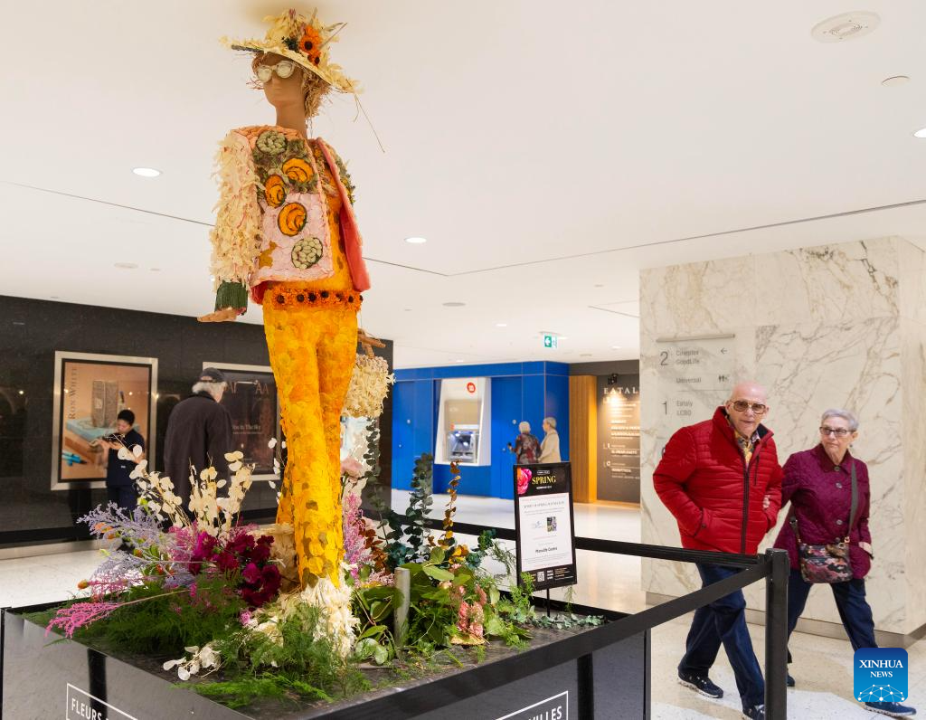 People walk past a floral mannequin during the 2025 Fleurs de Villes SPRING event in Toronto, Canada, on May 8, 2025. Featuring over 30 floral installations created by local florists, the annual event is held here from May 7 to May 11 this year. (Photo by Zou Zheng/Xinhua)