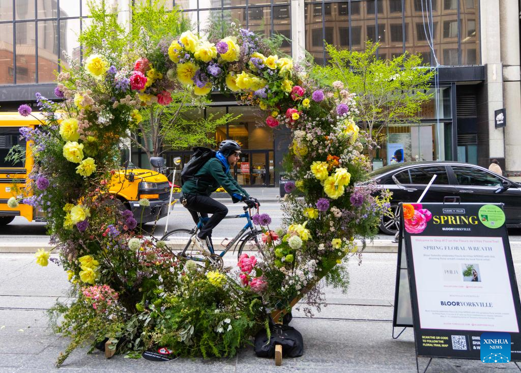 A cyclist passes a floral installation during the 2025 Fleurs de Villes SPRING event in Toronto, Canada, on May 8, 2025. Featuring over 30 floral installations created by local florists, the annual event is held here from May 7 to May 11 this year. (Photo by Zou Zheng/Xinhua)