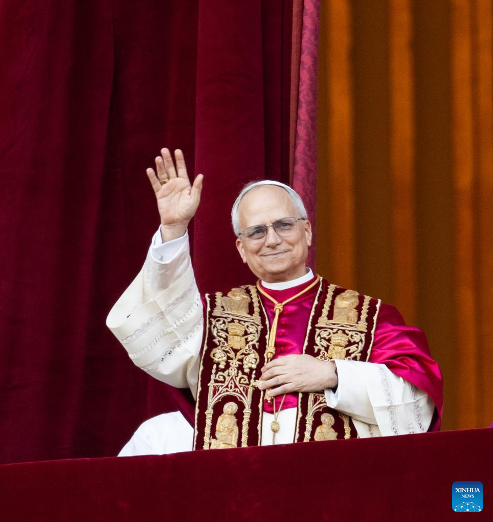 Robert Francis Prevost waves to the crowd after being elected the new pope in Vatican City, on May 8, 2025. Robert Francis Prevost, the cardinal of the United States, was elected the new pope on the second day of secret ballots in the cardinals' conclave held in Vatican City. The name he chose as the new pope was Leo XIV. (Xinhua/Li Jing)