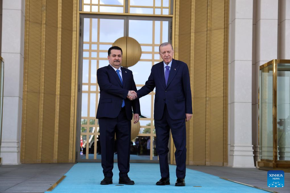 Turkish President Recep Tayyip Erdogan (R) welcomes visiting Iraqi Prime Minister Mohammed Shia' al-Sudani at the Presidential Palace in Ankara, Türkiye, on May 8, 2025. Turkish President Recep Tayyip Erdogan and visiting Iraqi Prime Minister Mohammed Shia' al-Sudani vowed here on Thursday to jointly push for the implementation of the regional transportation project Development Road. (Mustafa Kaya/Handout via Xinhua)