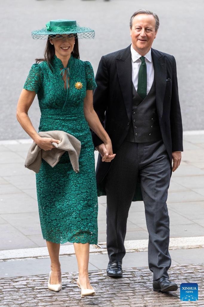 Former British Prime Minister David Cameron (R) arrives at Westminster Abbey to attend a service of thanksgiving to mark the 80th anniversary of VE Day, or Victory in Europe Day, in London, Britain, May 8, 2025. (Xinhua)