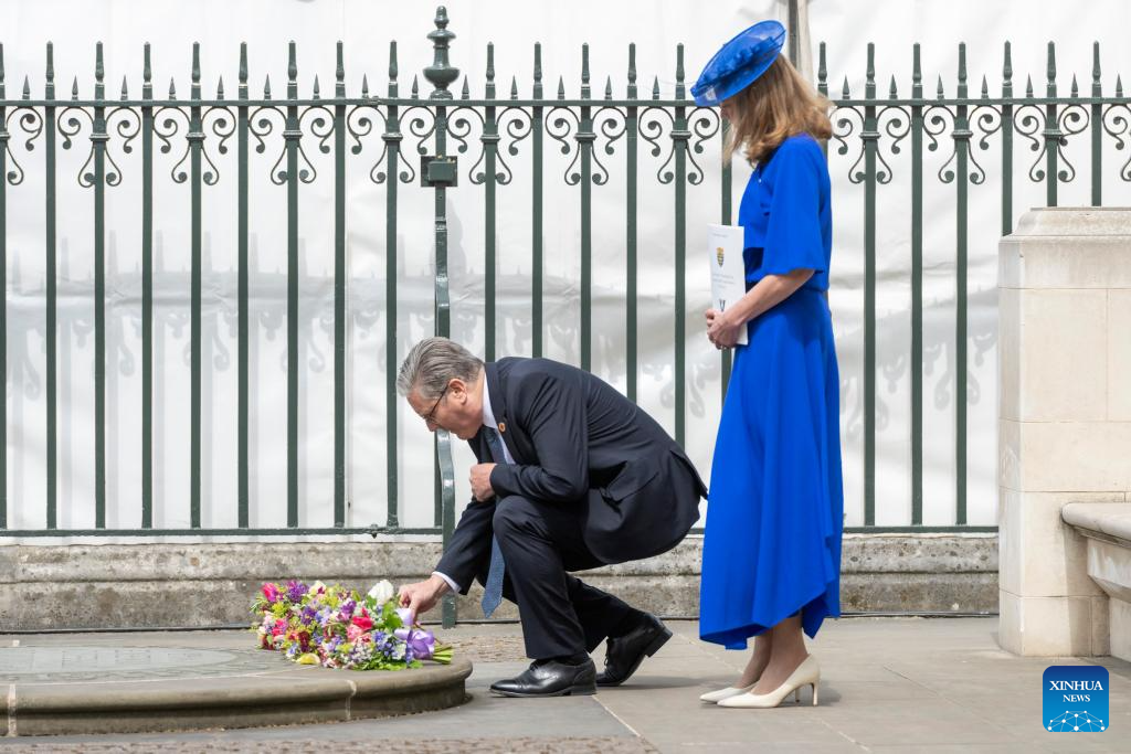 British Prime Minister Keir Starmer (L) lays flowers following a service of thanksgiving to mark the 80th anniversary of VE Day, or Victory in Europe Day, at Westminster Abbey in London, Britain, May 8, 2025. (Xinhua)