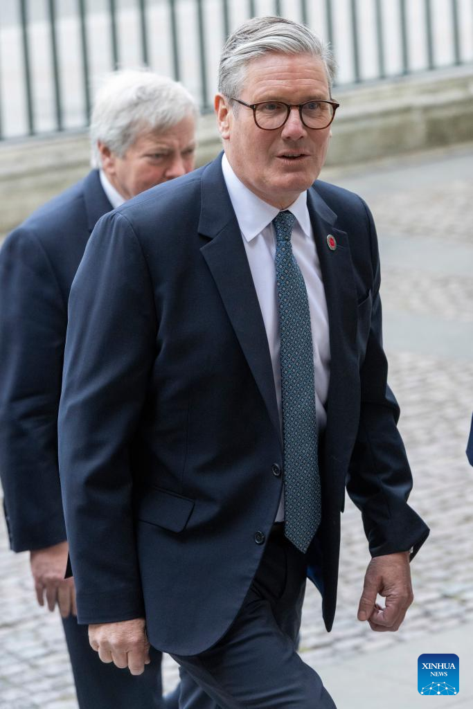British Prime Minister Keir Starmer arrives at Westminster Abbey to attend a service of thanksgiving to mark the 80th anniversary of VE Day, or Victory in Europe Day, in London, Britain, May 8, 2025. (Xinhua)