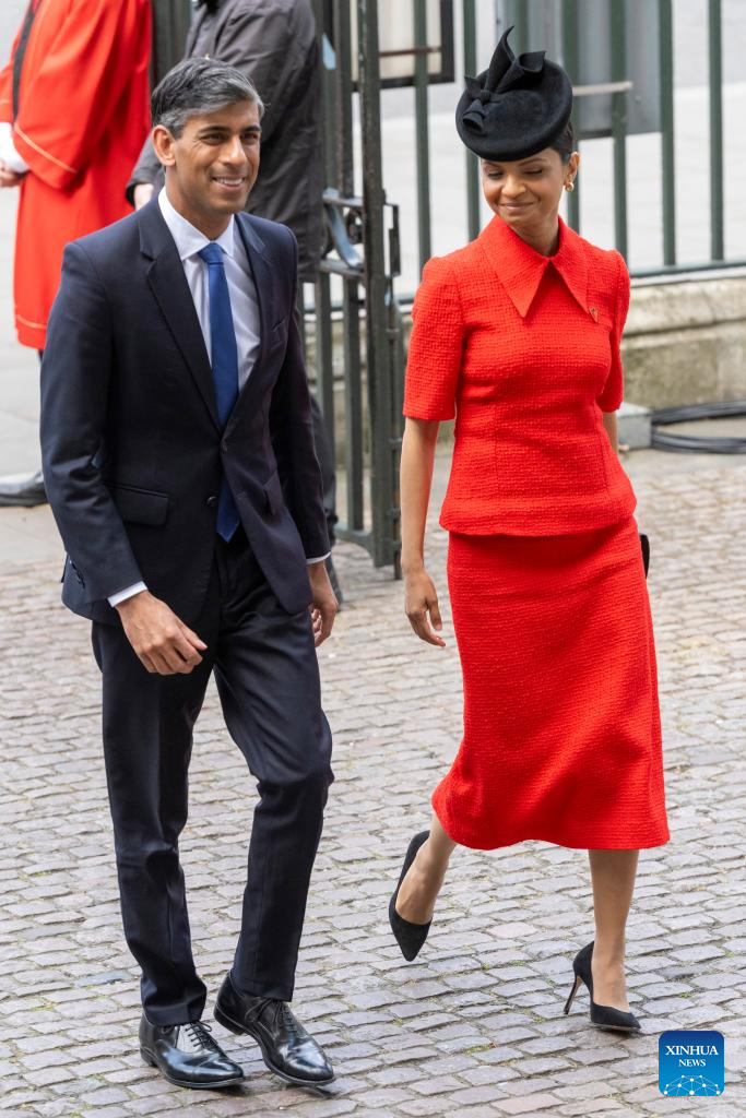 Former British Prime Minister Rishi Sunak (L) arrives at Westminster Abbey to attend a service of thanksgiving to mark the 80th anniversary of VE Day, or Victory in Europe Day, in London, Britain, May 8, 2025. (Xinhua)