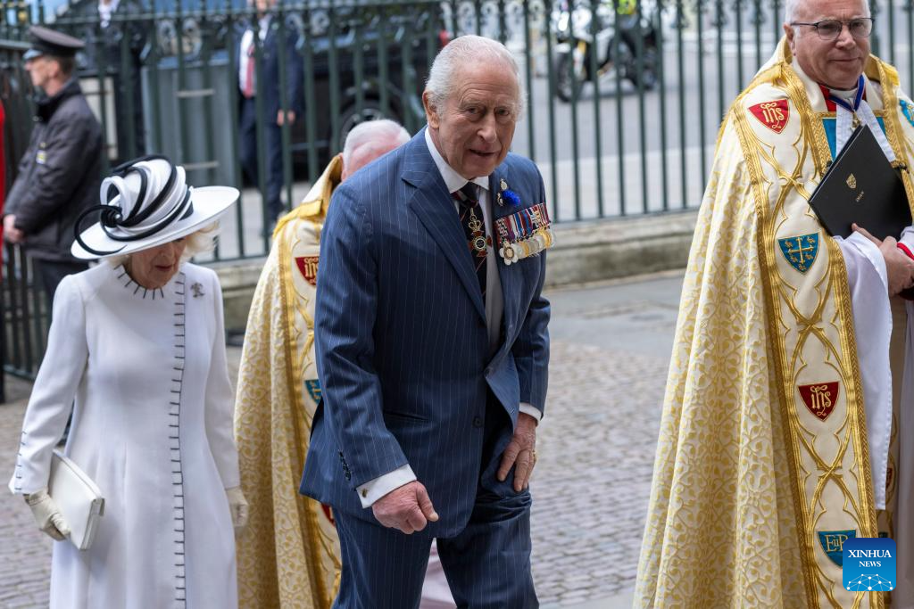 Britain's King Charles III (C) and Queen Camilla (L) arrive at Westminster Abbey to attend a service of thanksgiving to mark the 80th anniversary of VE Day, or Victory in Europe Day, in London, Britain, May 8, 2025. (Xinhua)
