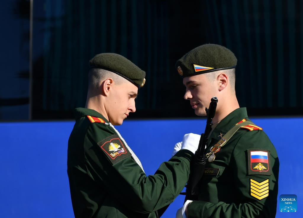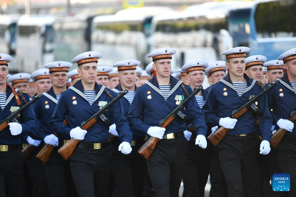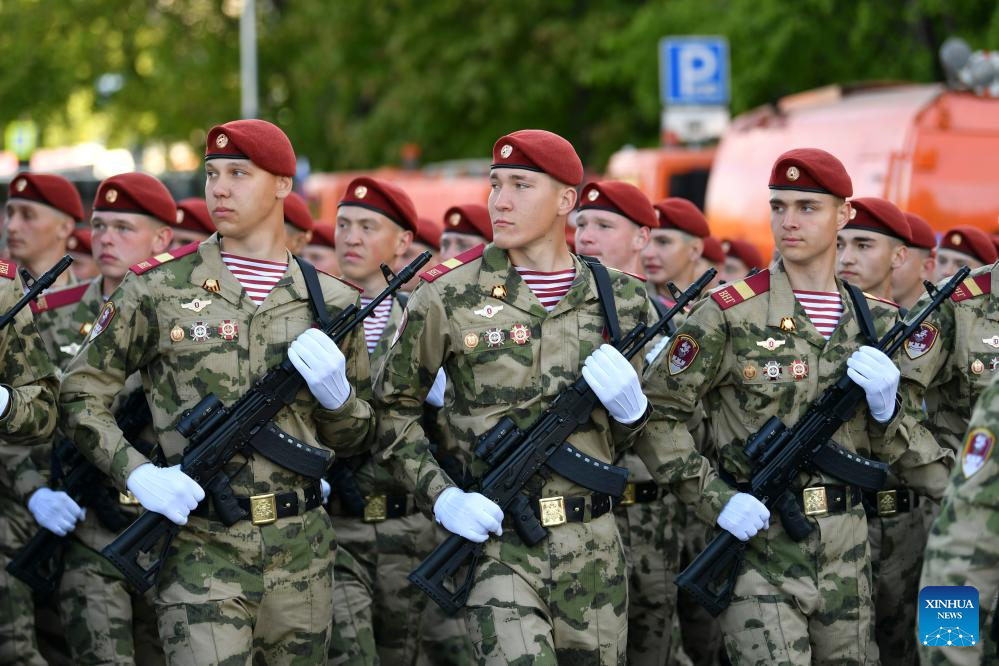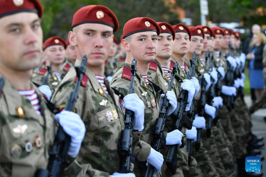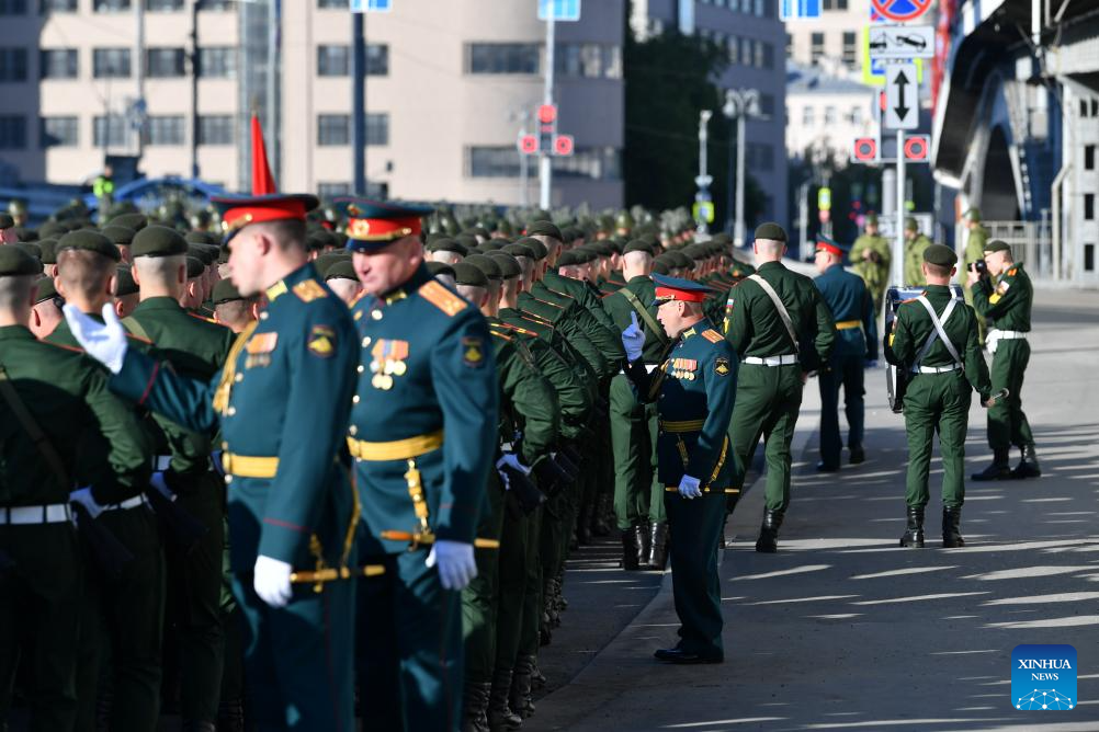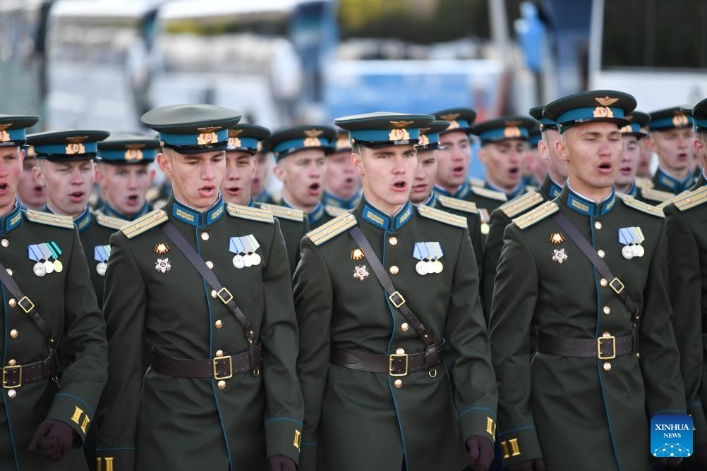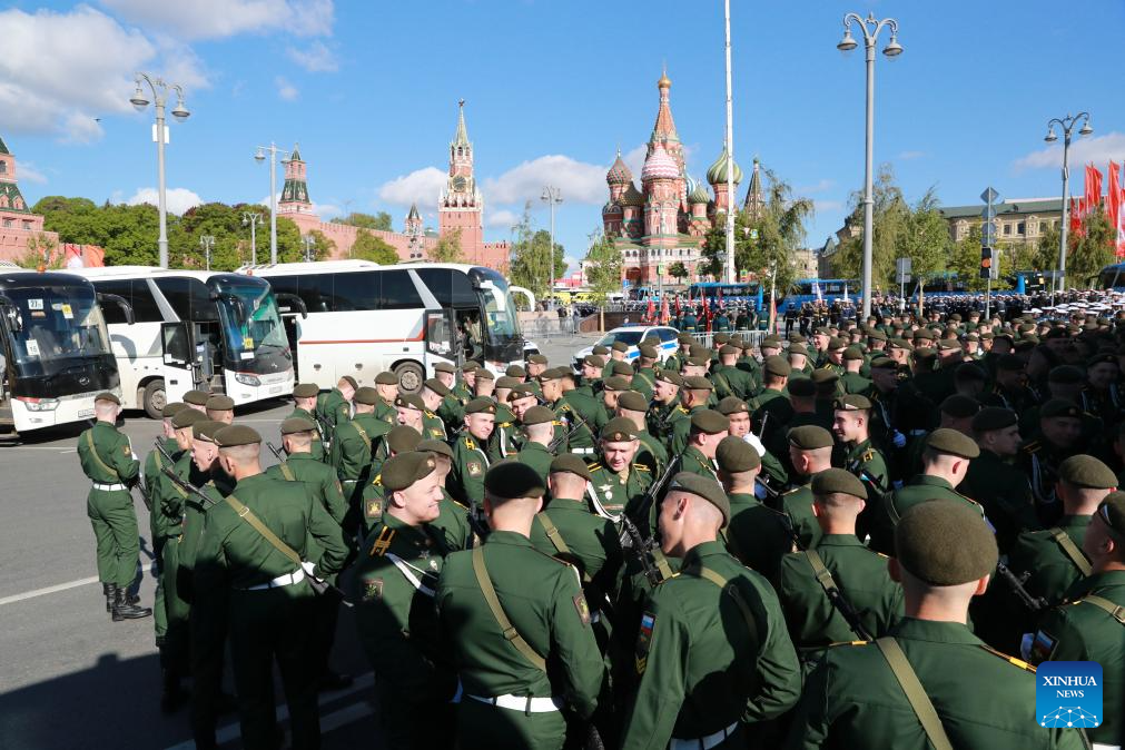 Military personnel are about to attend a military parade marking the 80th anniversary of the victory in the Soviet Union's Great Patriotic War in Moscow, Russia, May 9, 2025. (Xinhua/Bai Xueqi)