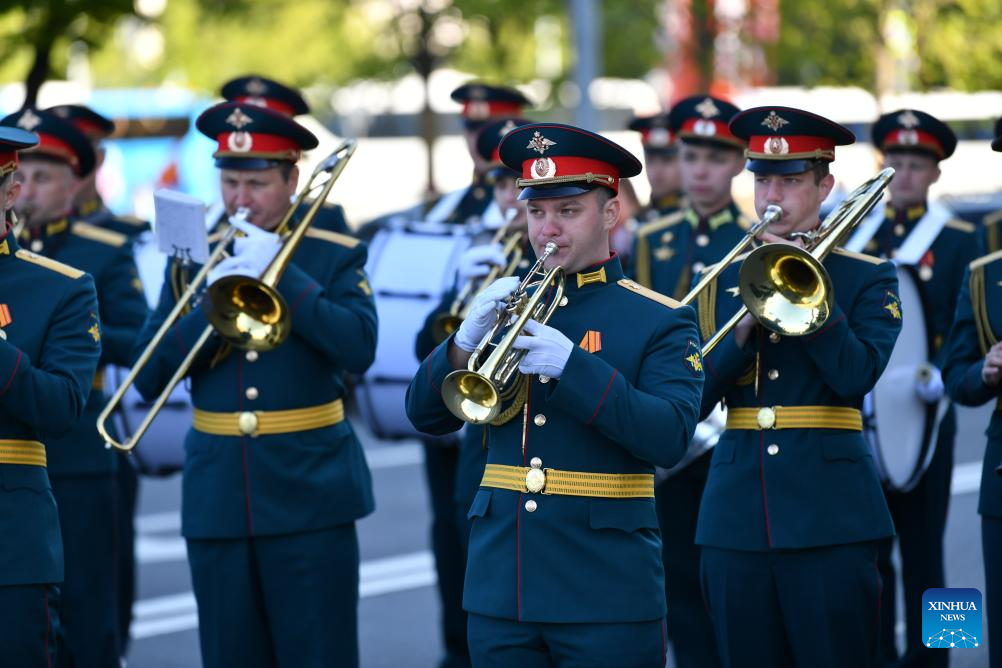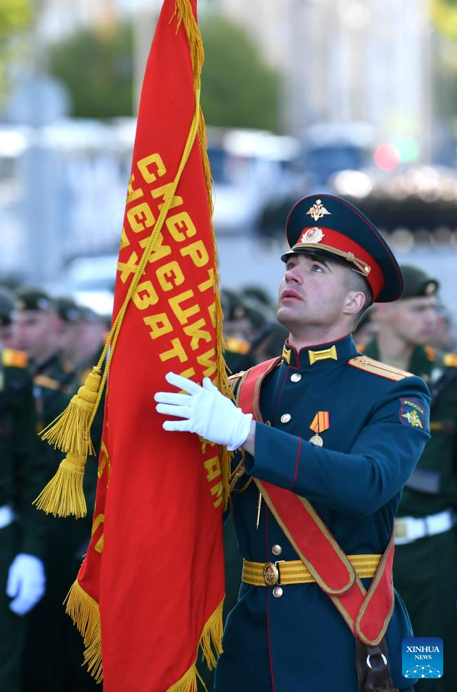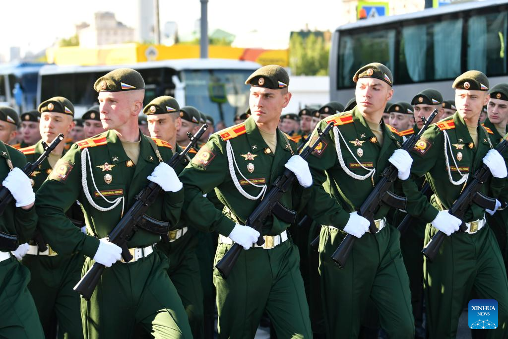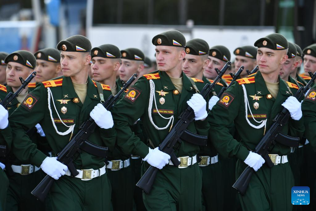 Soldiers make preparation before a military parade marking the 80th anniversary of the victory in the Soviet Union's Great Patriotic War in Moscow, Russia, May 9, 2025. (Xinhua/Cao Yang)
