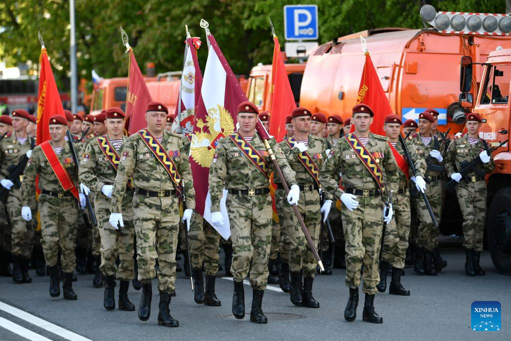 Military personnel are about to attend a military parade marking the 80th anniversary of the victory in the Soviet Union's Great Patriotic War in Moscow, Russia, May 9, 2025. (Xinhua/Cao Yang)