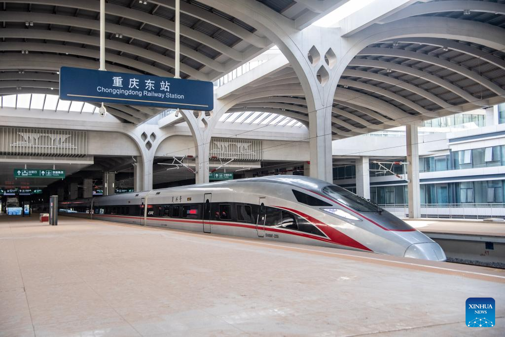 The high-speed test train departs from Chongqing East Railway Station in southwest China's Chongqing Municipality, May 9, 2025. With the departure of the high-speed test train from Chongqing East Railway Station, the joint debugging and test of Chongqing section of the newly-built Chongqing-Xiamen high-speed railway were successfully completed and started its test operation on Friday. (Xinhua/Tang Yi)