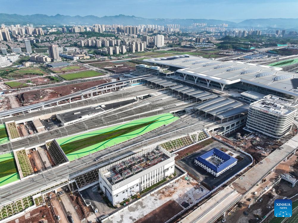 An aerial drone photo shows the high-speed test train departing from Chongqing East Railway Station in southwest China's Chongqing Municipality, May 9, 2025. With the departure of the high-speed test train from Chongqing East Railway Station, the joint debugging and test of Chongqing section of the newly-built Chongqing-Xiamen high-speed railway were successfully completed and started its test operation on Friday. (Xinhua/Tang Yi)