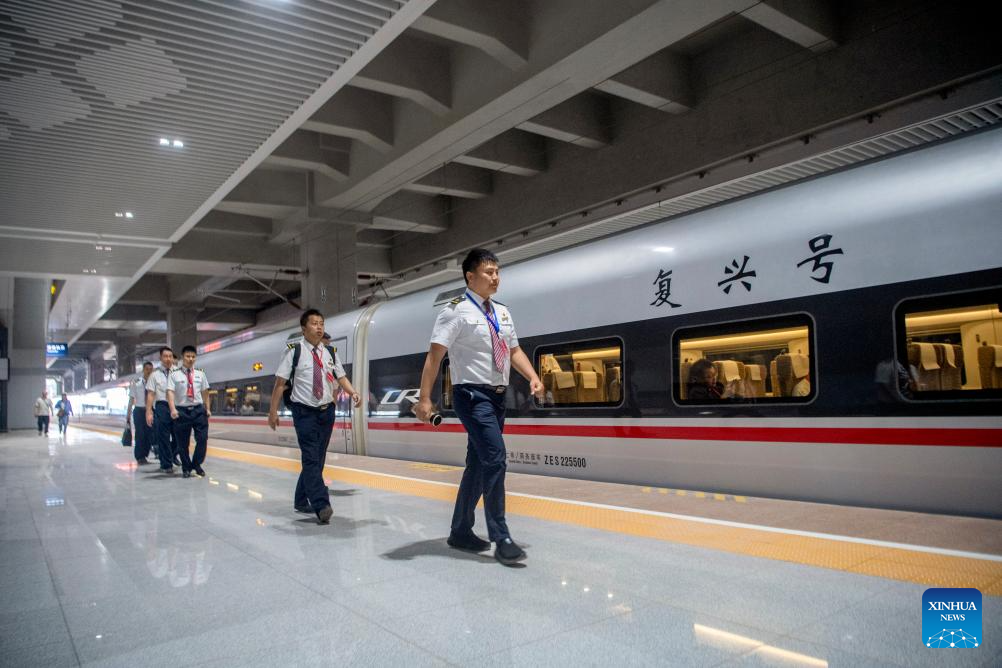 Railway staff prepare to board the high-speed test train in southwest China's Chongqing Municipality, May 9, 2025. With the departure of the high-speed test train from Chongqing East Railway Station, the joint debugging and test of Chongqing section of the newly-built Chongqing-Xiamen high-speed railway were successfully completed and started its test operation on Friday. (Xinhua/Tang Yi)