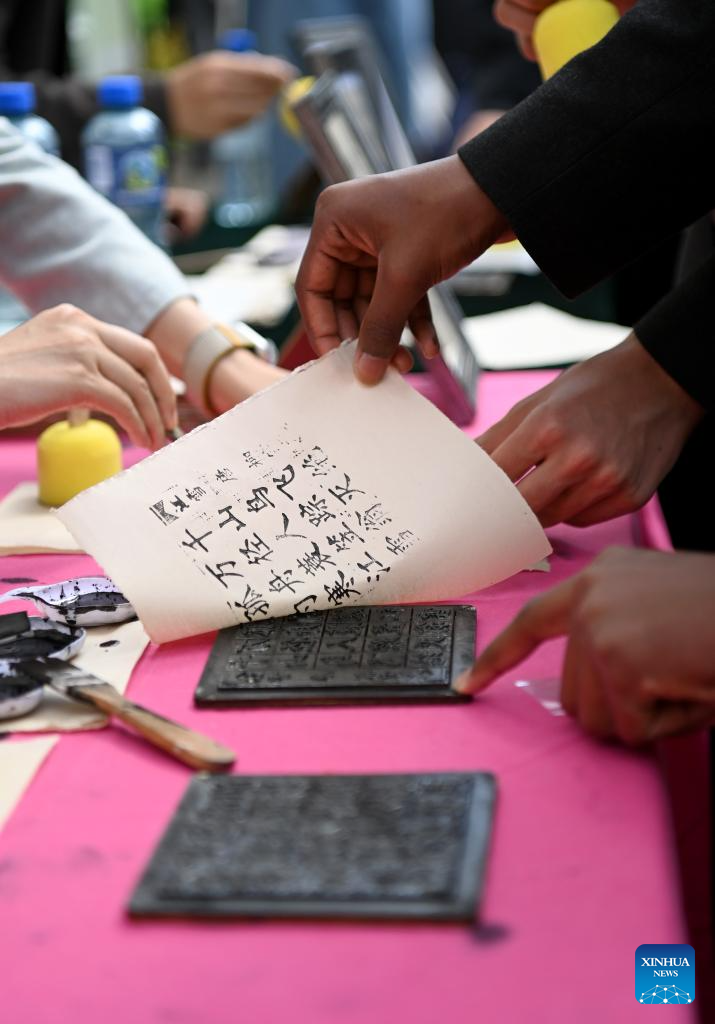 A student attends a woodblock printing workshop during an event marking Chinese Language Day in London, Britain, on May 8, 2025. An event marking this year's Chinese Language Day was held on Thursday in London, bringing together around 100 students from six schools across Britain to celebrate the Chinese language and culture. (Xinhua/Jia Yuchen)