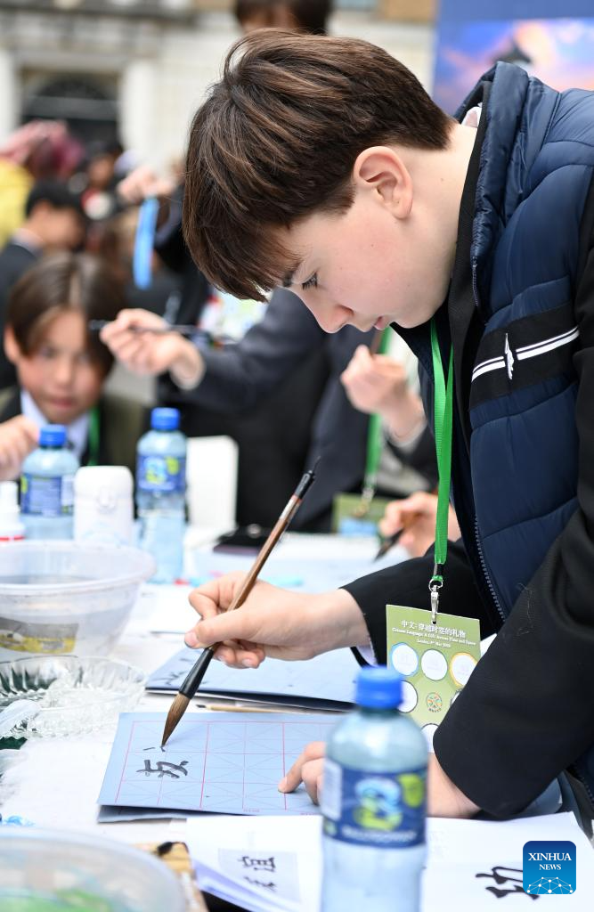 Students attend a Chinese calligraphy workshop during an event marking Chinese Language Day in London, Britain, on May 8, 2025. An event marking this year's Chinese Language Day was held on Thursday in London, bringing together around 100 students from six schools across Britain to celebrate the Chinese language and culture. (Xinhua/Jia Yuchen)