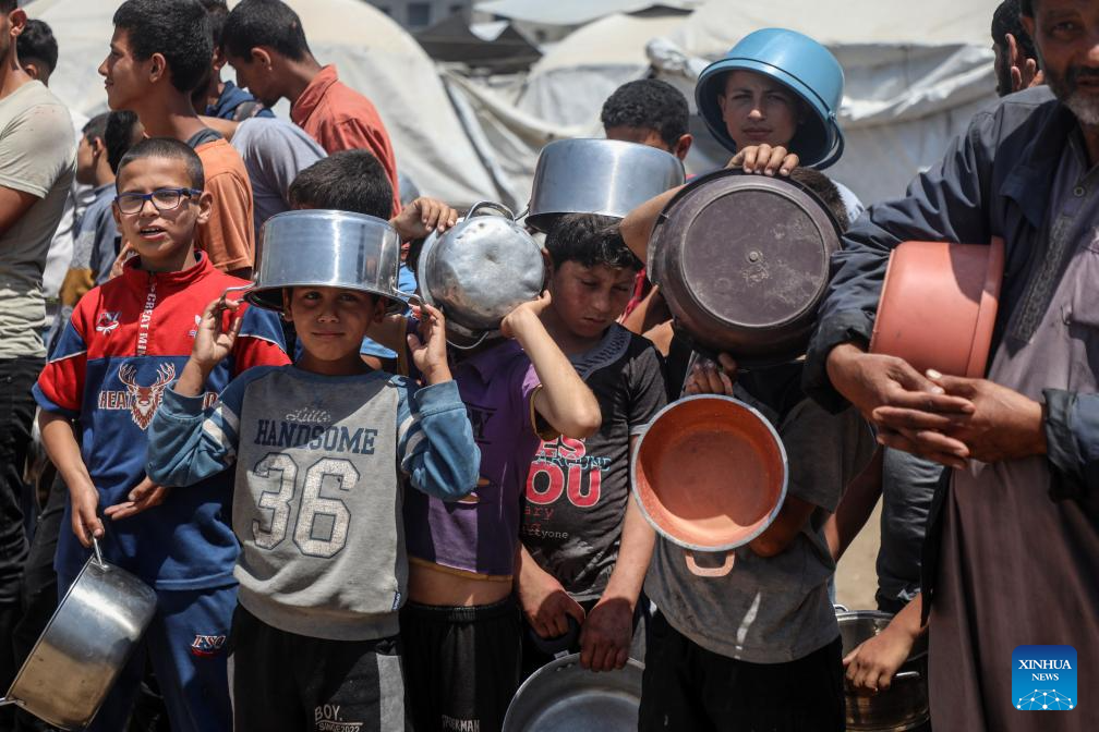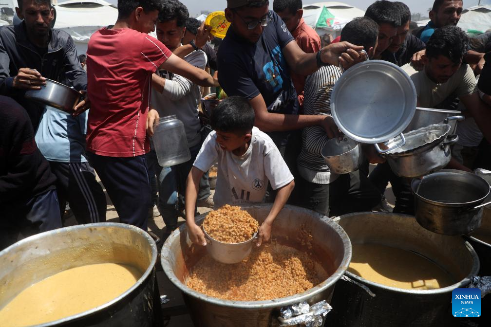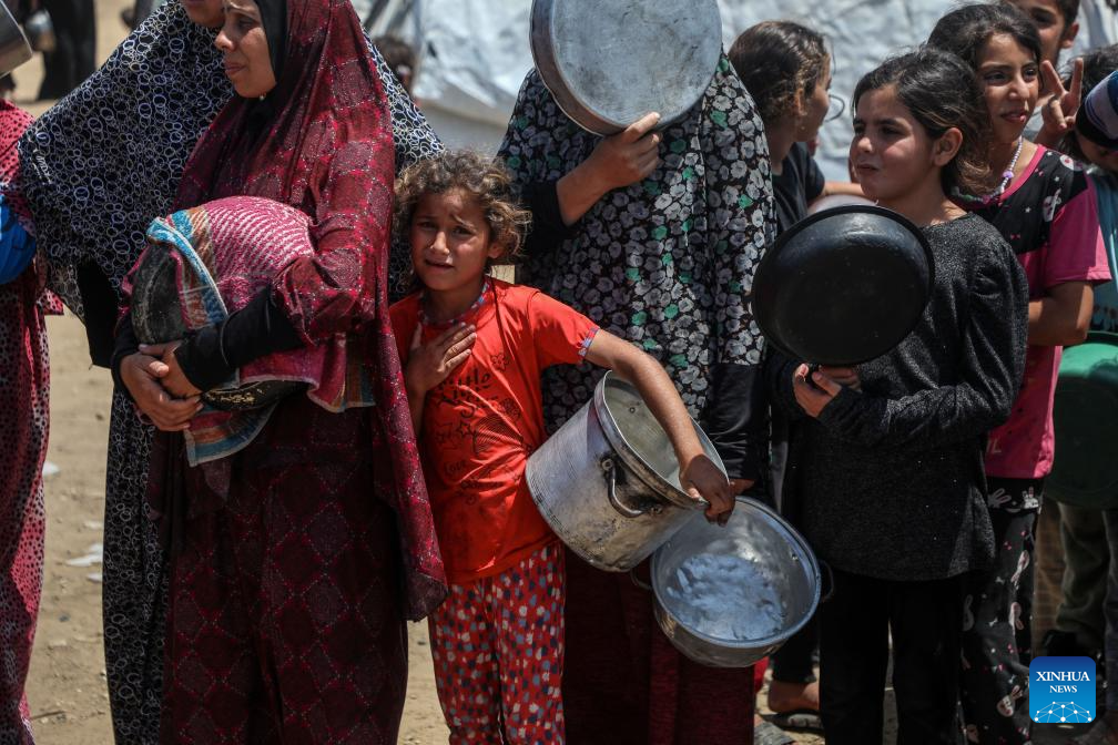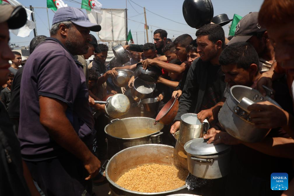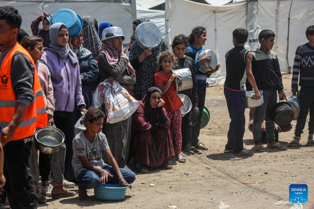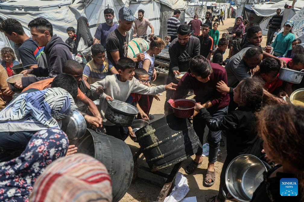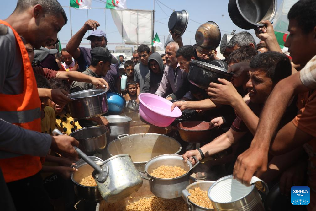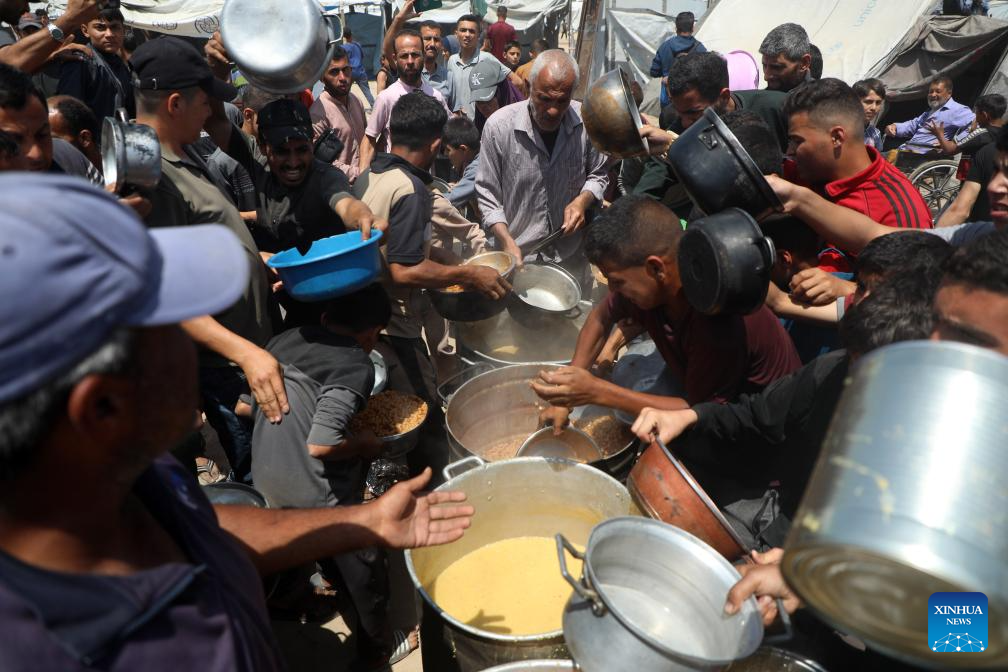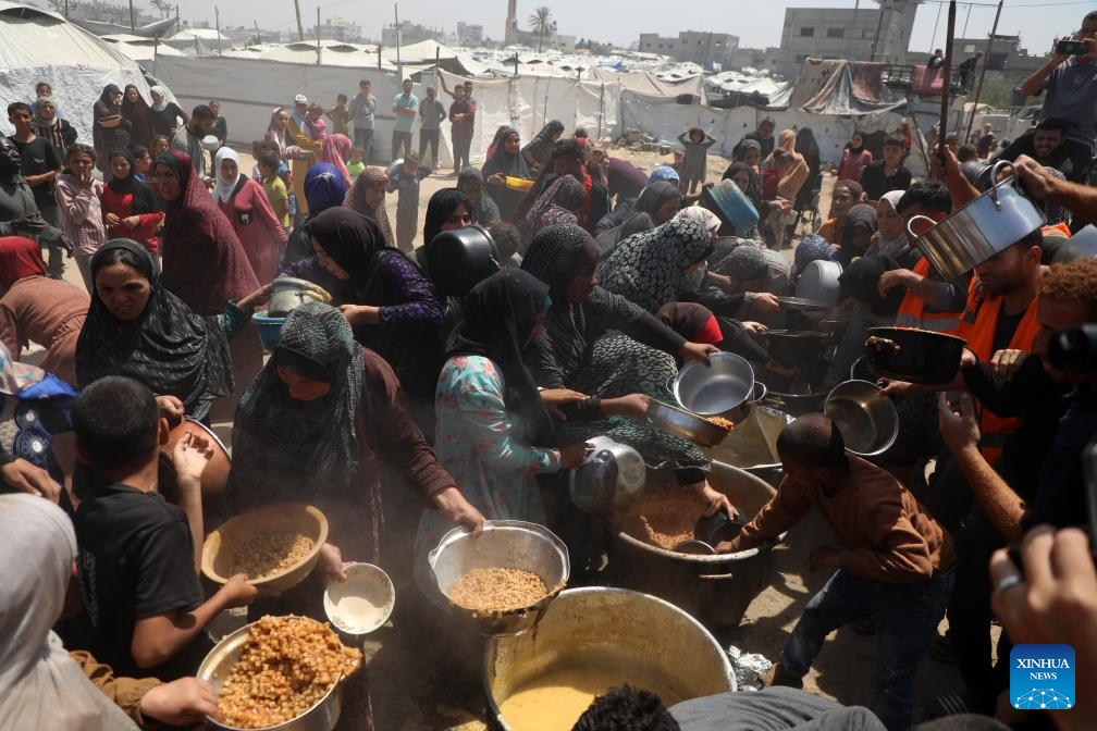 Palestinians receive free food from a food distribution center in Gaza City, on May 9, 2025. (Photo by Rizek Abdeljawad/Xinhua)