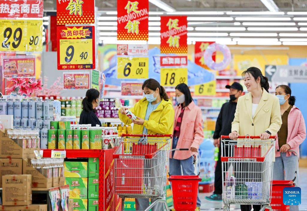 People shop at a supermarket in Qingzhou City, east China's Shandong Province, May 10, 2025. China's consumer price index (CPI), a main gauge of inflation, edged down 0.1 percent year on year in April, the National Bureau of Statistics (NBS) said Saturday. Core CPI, which excludes food and energy prices, rose 0.5 percent year on year. (Photo by Wang Jilin/Xinhua)