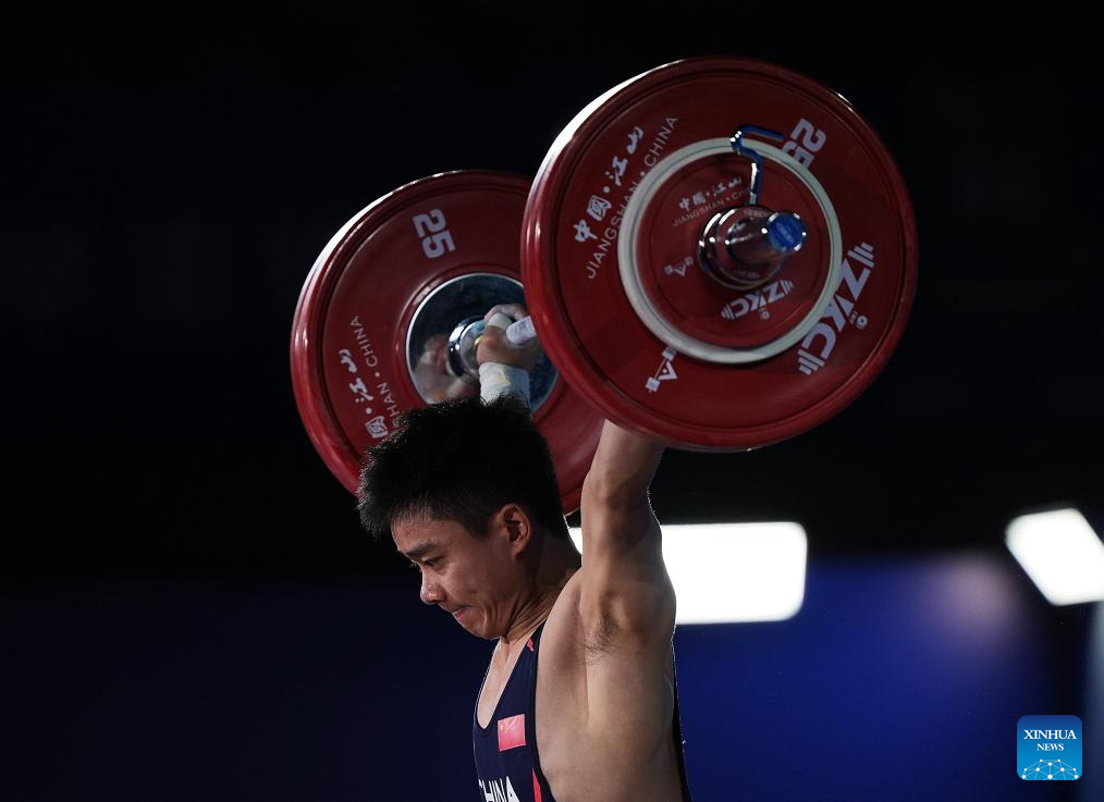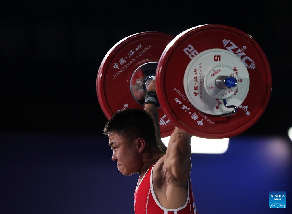 Wang Min of China competes during the men's 61kg competition at 2025 Asian Weightlifting Championships in Jiangshan, east China's Zhejiang Province, May 10, 2025. (Xinhua/Hou Zhaokang)