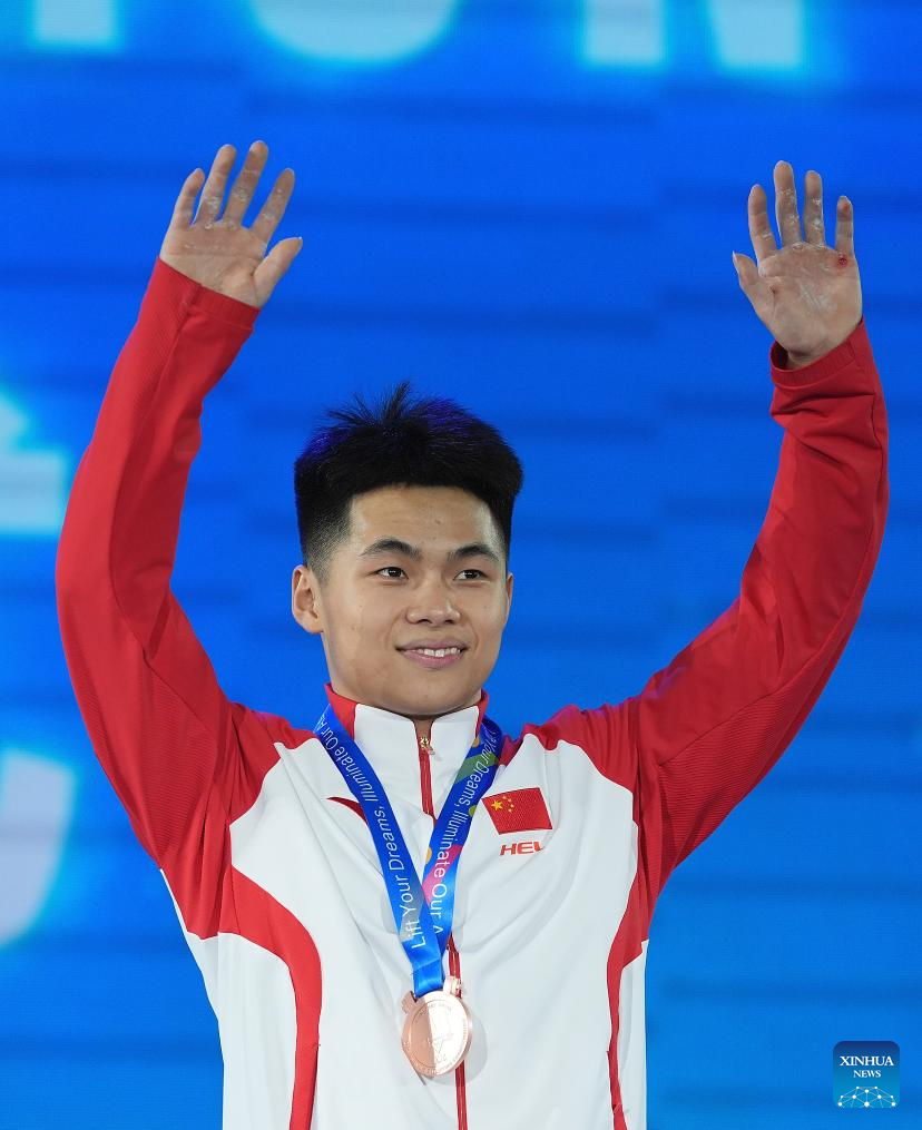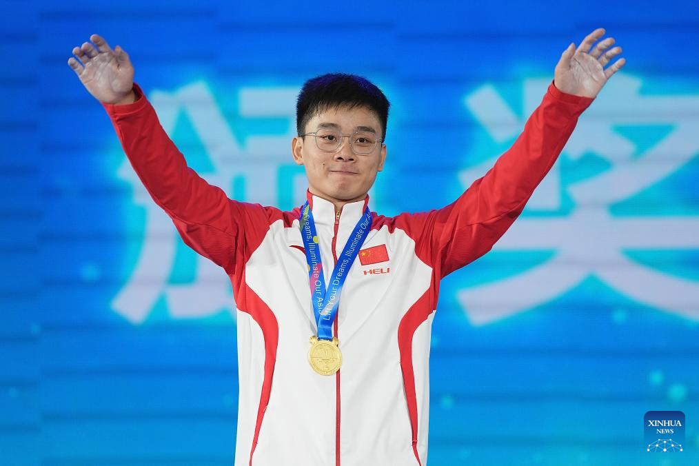 Wang Min of China poses during the awarding ceremony for the men's 61kg competition at 2025 Asian Weightlifting Championships in Jiangshan, east China's Zhejiang Province, May 10, 2025. (Xinhua/Hou Zhaokang)