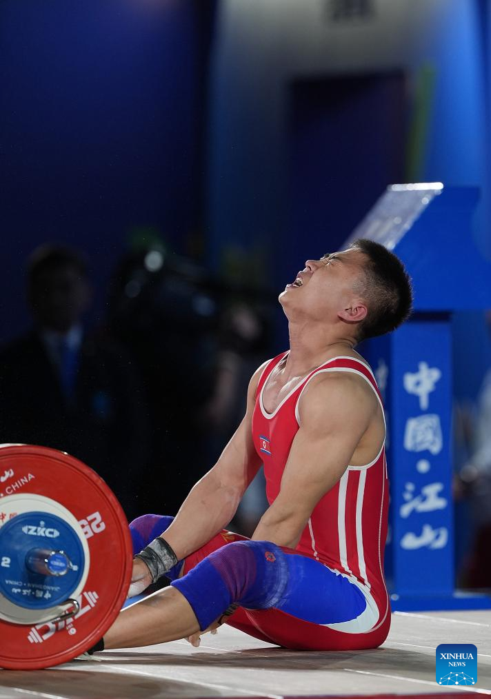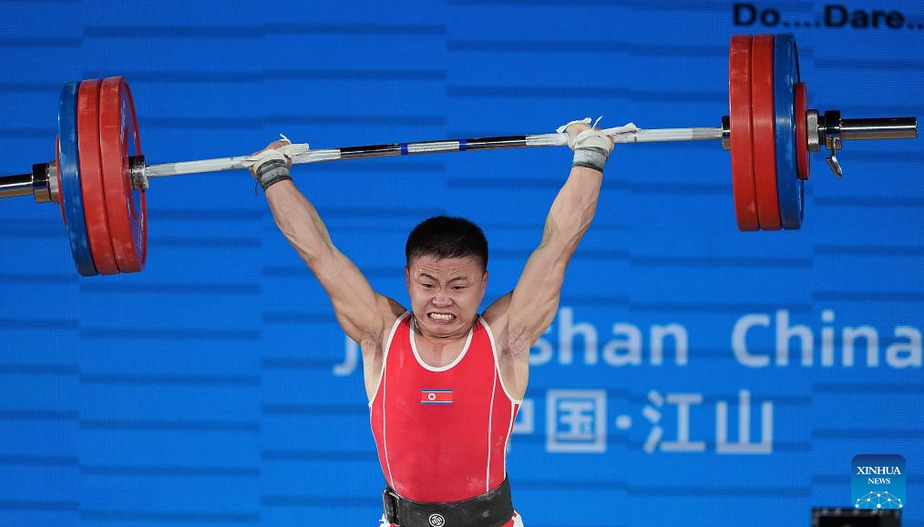 Pak Myong Jin of the Democratic People's Republic of Korea (DPRK) competes during the men's 61kg competition at 2025 Asian Weightlifting Championships in Jiangshan, east China's Zhejiang Province, May 10, 2025. (Xinhua/Hou Zhaokang)