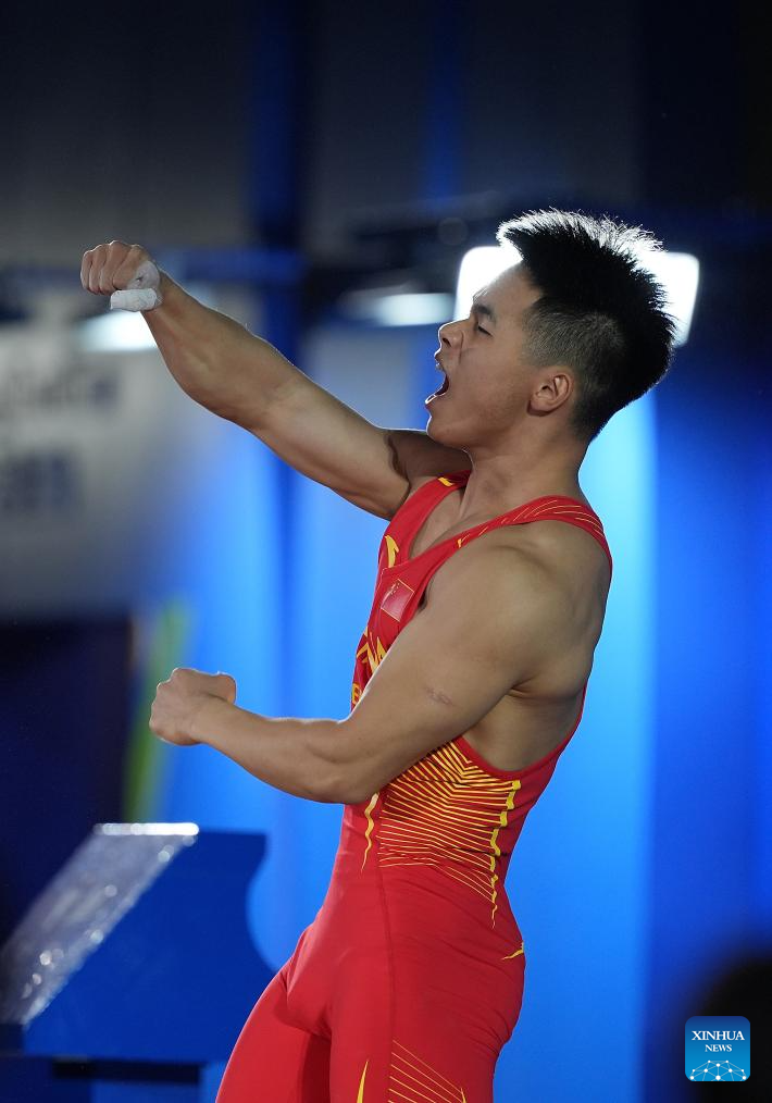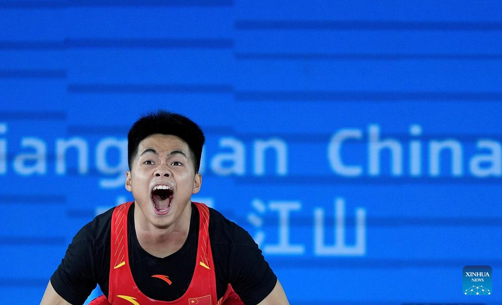 Wang Min of China celebrates during the men's 61kg competition at 2025 Asian Weightlifting Championships in Jiangshan, east China's Zhejiang Province, May 10, 2025. (Xinhua/Hou Zhaokang)