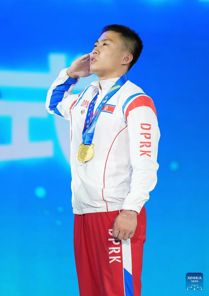 Pak Myong Jin of the Democratic People's Republic of Korea (DPRK) sings the national anthem during the men's 61kg competition at 2025 Asian Weightlifting Championships in Jiangshan, east China's Zhejiang Province, May 10, 2025. (Xinhua/Hou Zhaokang)