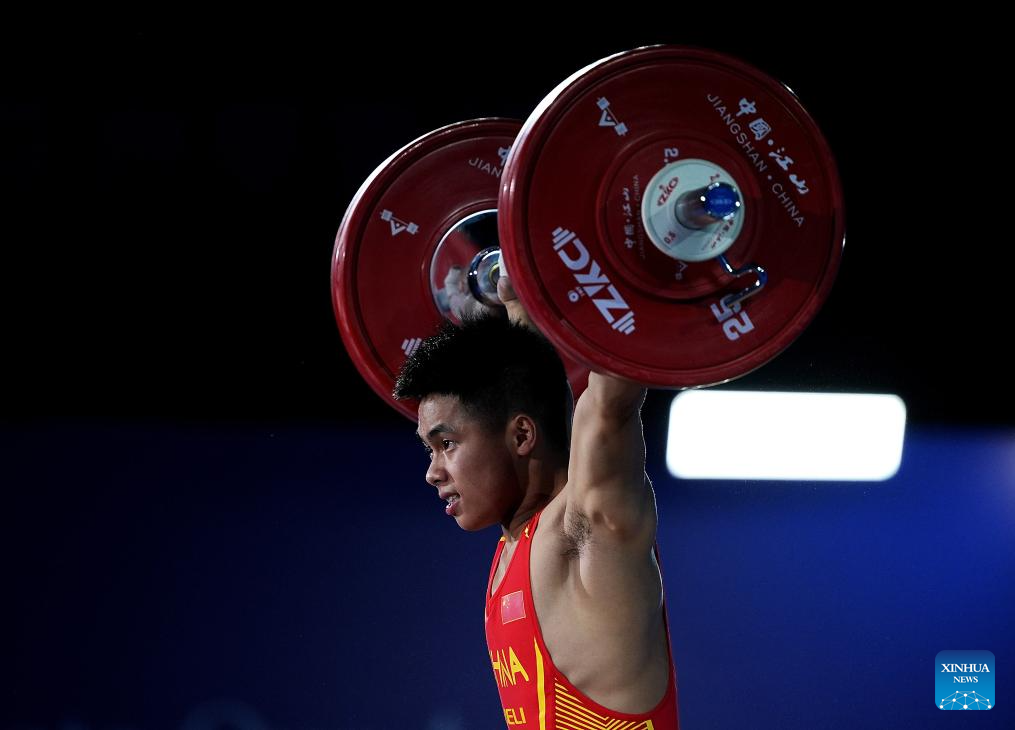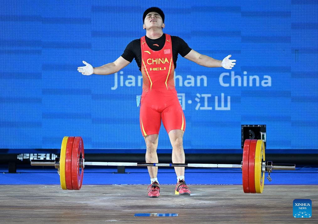 Wang Hao of China competes during the men's 61kg competition at 2025 Asian Weightlifting Championships in Jiangshan, east China's Zhejiang Province, May 10, 2025. (Xinhua/Hou Zhaokang)