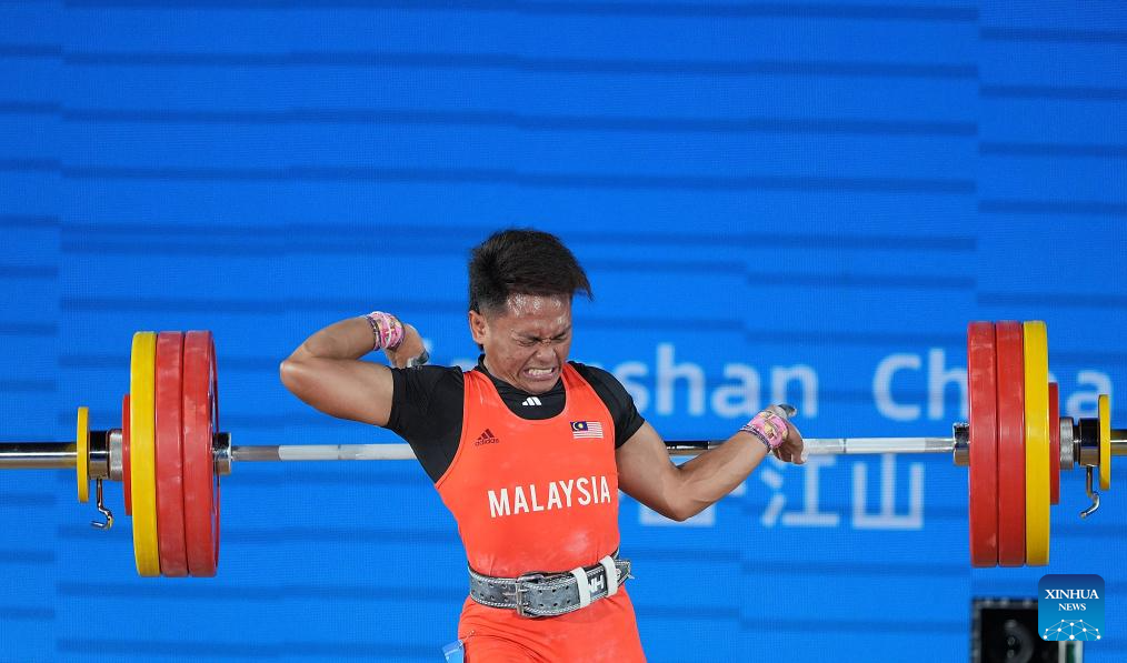 Bin Kasdan Mohamad Aniq of Malaysia competes during the men's 61kg competition at 2025 Asian Weightlifting Championships in Jiangshan, east China's Zhejiang Province, May 10, 2025. (Xinhua/Hou Zhaokang)