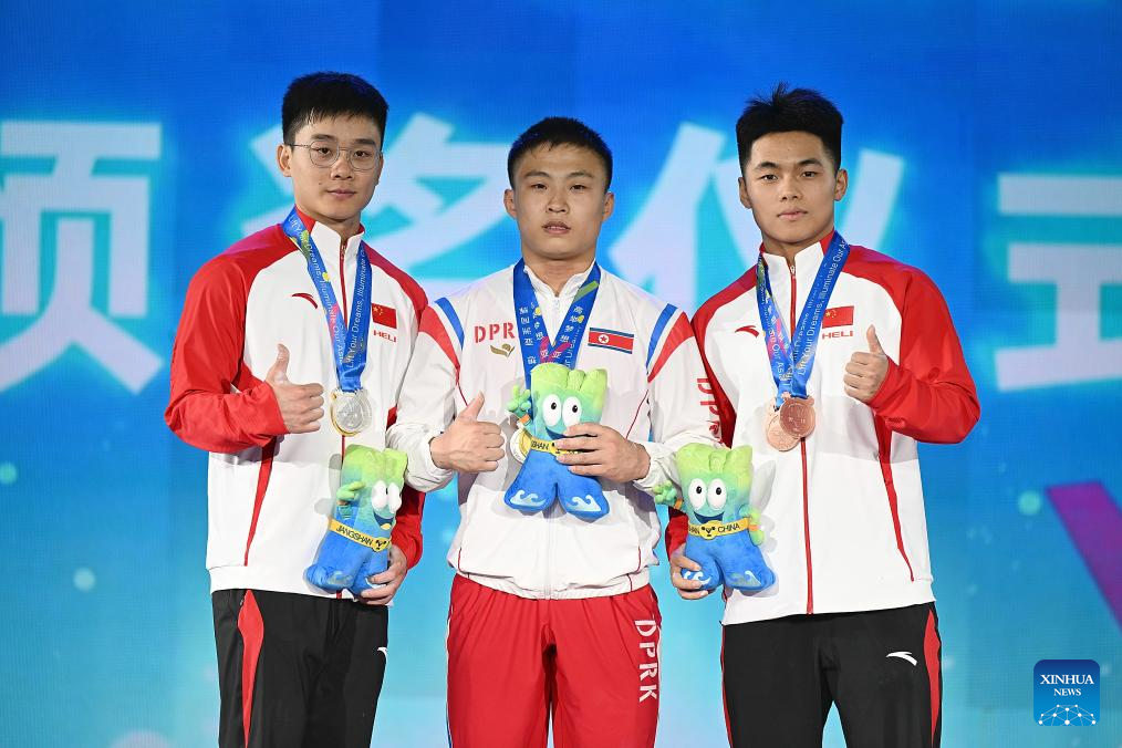 Total gold medalist Pak Myong Jin (C) of the Democratic People's Republic of Korea (DPRK), silver medalist Wang Hao (L) of China and bronze medalist Wang Min of China pose during the awarding ceremony for the men's 61kg competition at 2025 Asian Weightlifting Championships in Jiangshan, east China's Zhejiang Province, May 10, 2025. (Xinhua/Hou Zhaokang)