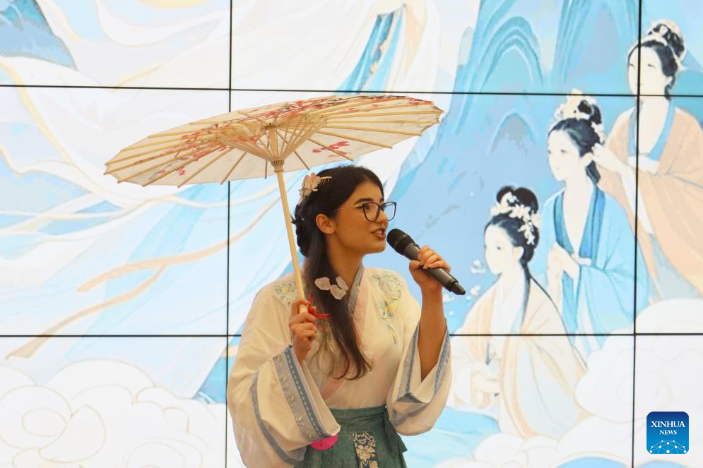 A competitor performs during the 24th "Chinese Bridge" Chinese Proficiency Competition for College Students in Cluj-Napoca, Romania, May 10, 2025. The Romanian division finals of the 24th "Chinese Bridge" Chinese Proficiency Competition for College Students was held here on Saturday. (Photo by Lu Jicheng/Xinhua)