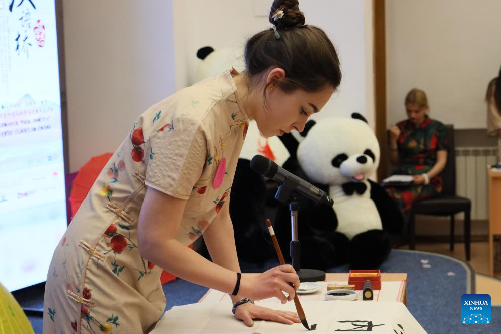 A competitor writes calligraphy during the 24th "Chinese Bridge" Chinese Proficiency Competition for College Students in Cluj-Napoca, Romania, May 10, 2025. The Romanian division finals of the 24th "Chinese Bridge" Chinese Proficiency Competition for College Students was held here on Saturday. (Photo by Lu Jicheng/Xinhua)