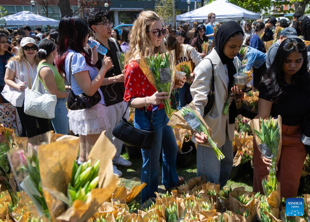 People visit the Toronto Flower Market in Toronto, Canada, on May 10, 2025. The traditional monthly market is held here from May to October, one day each month. (Photo by Zou Zheng/Xinhua)