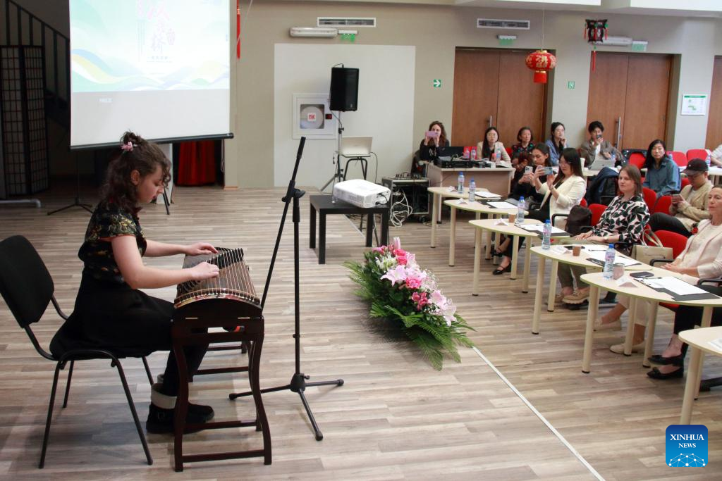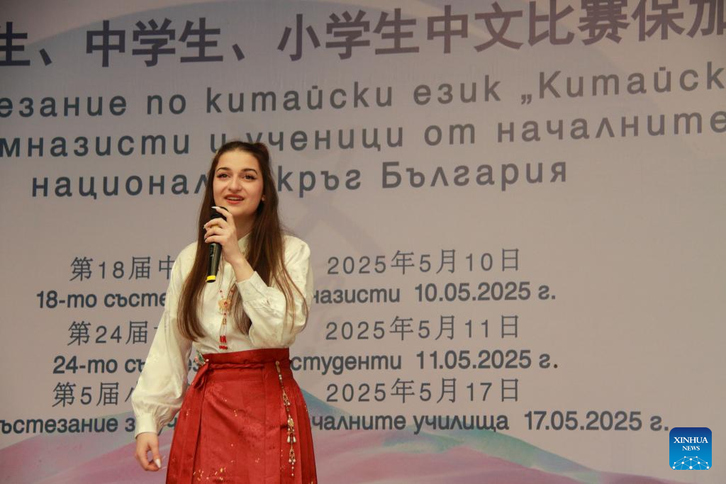 A participant performs during the national qualification contest of the 18th "Chinese Bridge" Chinese Proficiency Competition for foreign secondary school students in Sofia, Bulgaria, May 10, 2025. (Photo by Marian Draganov/Xinhua)