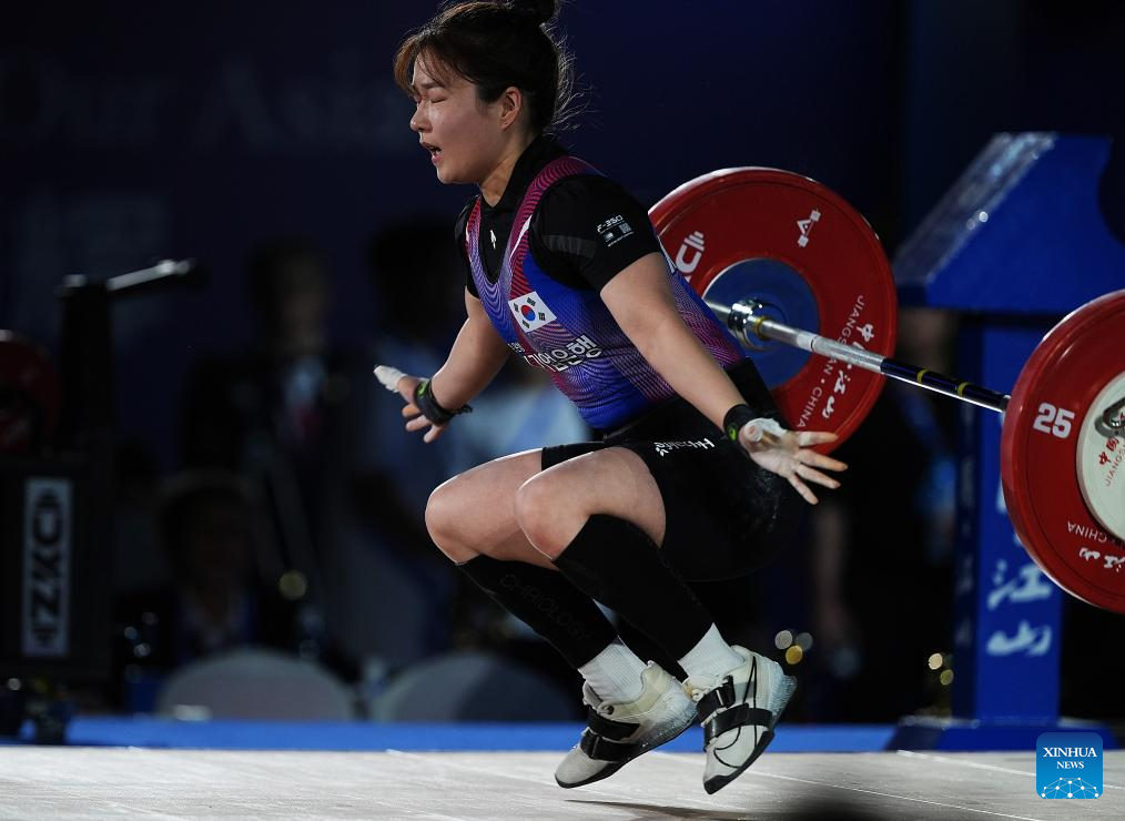 Kim Gayoung of South Korea competes during the women's 55kg competition at 2025 Asian Weightlifting Championships in Jiangshan, east China's Zhejiang Province, May 10, 2025. (Xinhua/Hou Zhaokang)