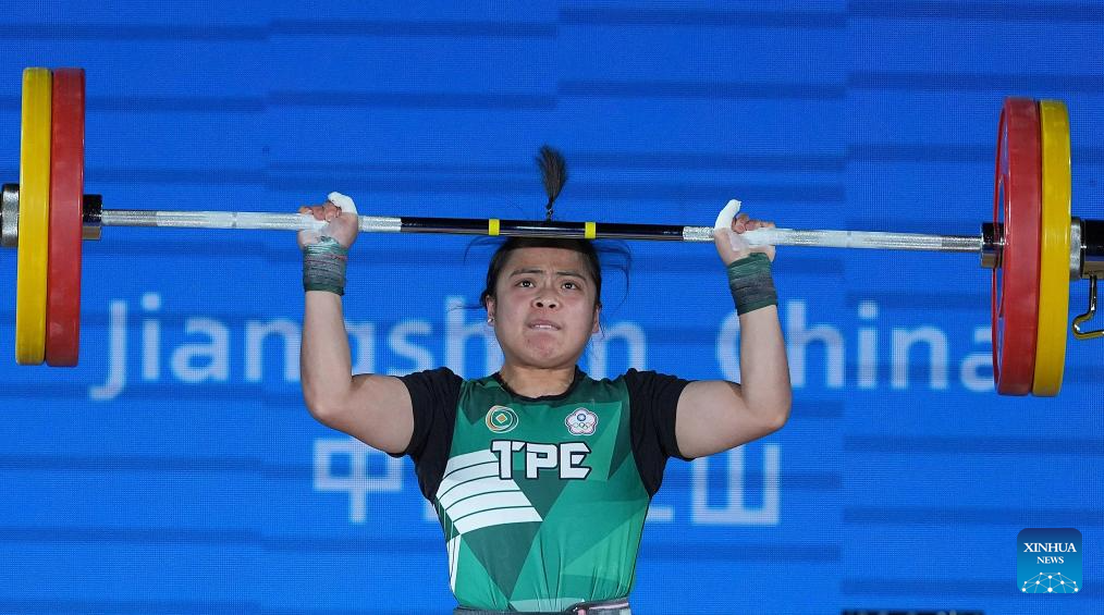 Hu Chia Chi of Chinese Taipei competes during the women's 55kg competition at 2025 Asian Weightlifting Championships in Jiangshan, east China's Zhejiang Province, May 10, 2025. (Xinhua/Hou Zhaokang)