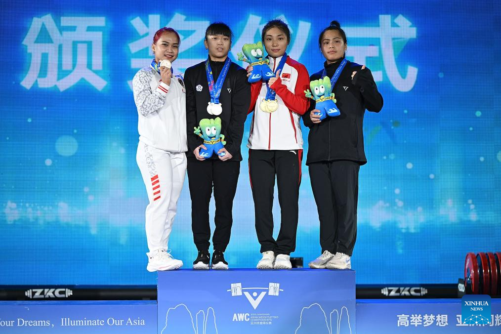 Total gold medalist Zhang Haiqin (2nd R) of China, silver medalist Chen Guan Ling (2nd L) of Chinese Taipei, bronze medalist Hu Chia Chi (1st R) of Chinese Taipei and bronze medalist for snatch Juliana Klarisa of Indonesia pose during the awarding ceremony for the women's 55kg competition at 2025 Asian Weightlifting Championships in Jiangshan, east China's Zhejiang Province, May 10, 2025. (Xinhua/Hou Zhaokang)