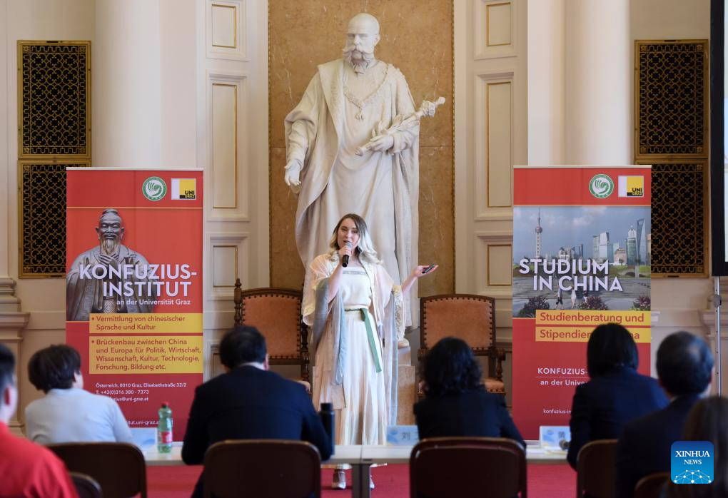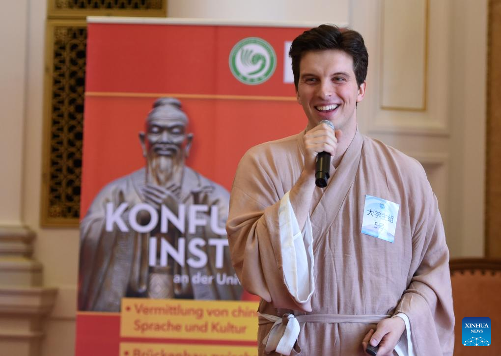 A contestant delivers a speech during the 24th "Chinese Bridge" Chinese Proficiency Competition for College Students in Graz, Austria, May 10, 2025. The Austrian division finals of the 24th "Chinese Bridge" Chinese Proficiency Competition for College Students was held on Saturday in Graz. (Xinhua/He Canling)
