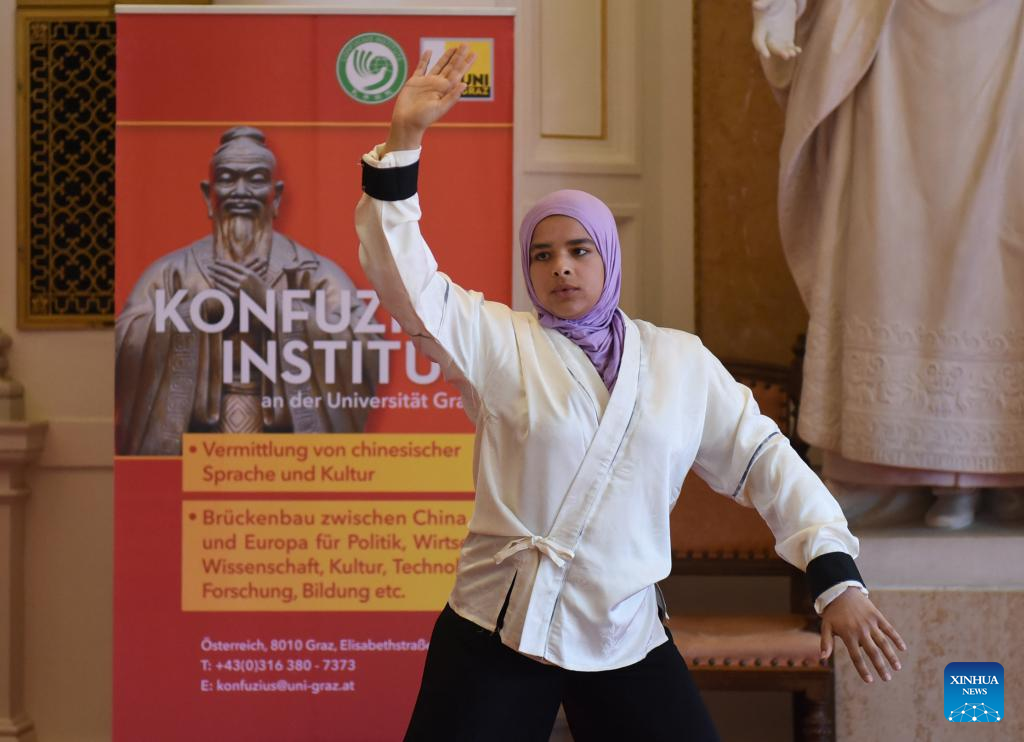 A contestant performs Tai Chi during the 24th "Chinese Bridge" Chinese Proficiency Competition for College Students in Graz, Austria, May 10, 2025. The Austrian division finals of the 24th "Chinese Bridge" Chinese Proficiency Competition for College Students was held on Saturday in Graz. (Xinhua/He Canling)