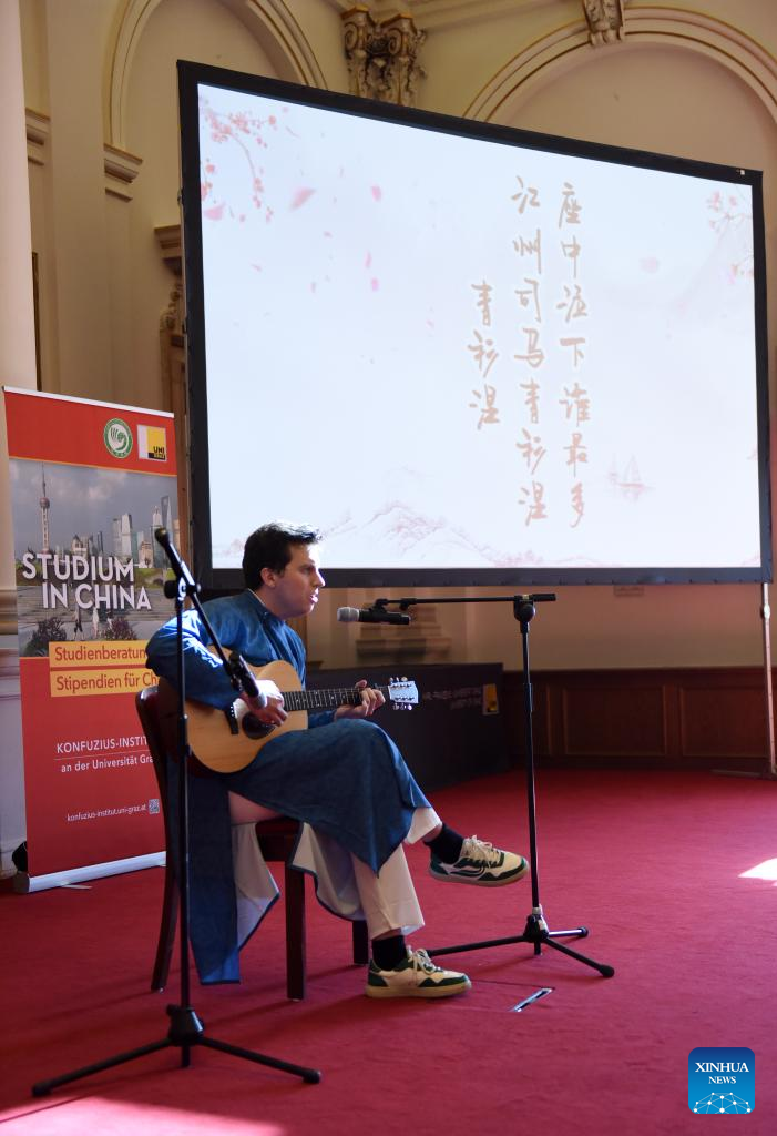 A contestant sings during the 24th "Chinese Bridge" Chinese Proficiency Competition for College Students in Graz, Austria, May 10, 2025. The Austrian division finals of the 24th "Chinese Bridge" Chinese Proficiency Competition for College Students was held on Saturday in Graz. (Xinhua/He Canling)
