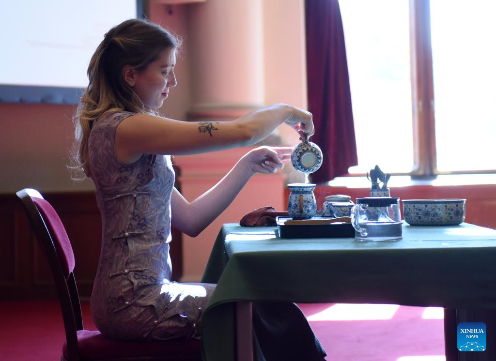 A contestant demonstrates tea art during the 24th "Chinese Bridge" Chinese Proficiency Competition for College Students in Graz, Austria, May 10, 2025. The Austrian division finals of the 24th "Chinese Bridge" Chinese Proficiency Competition for College Students was held on Saturday in Graz. (Xinhua/He Canling)