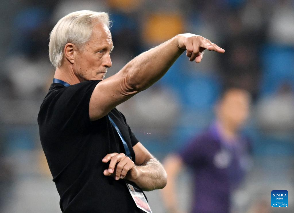 Jorn Anderson, head coach of Yunnan Yukun gestures during the 12nd round match between Tianjin Jinmen Tiger and Yunnan Yukun at the 2025 season Chinese Football Super League (CSL) in north China's Tianjin, May 11, 2025. (Xinhua/Zhao Zishuo)