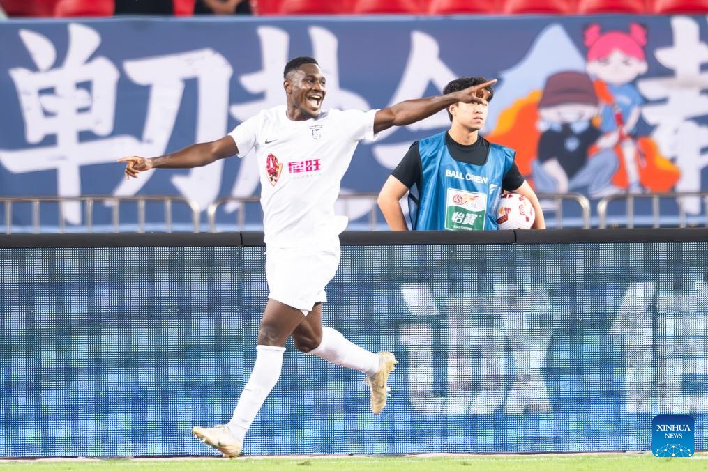 Cephas Malele (front) of Dalian Yingbo celebrates scoring during the 12th round match between Wuhan Three Towns FC and Dalian Yingbo at the 2025 season Chinese Football Super League (CSL) in Wuhan, central China's Hubei Province, May 11, 2025. (Xinhua/Xiao Yijiu)